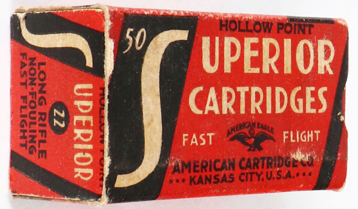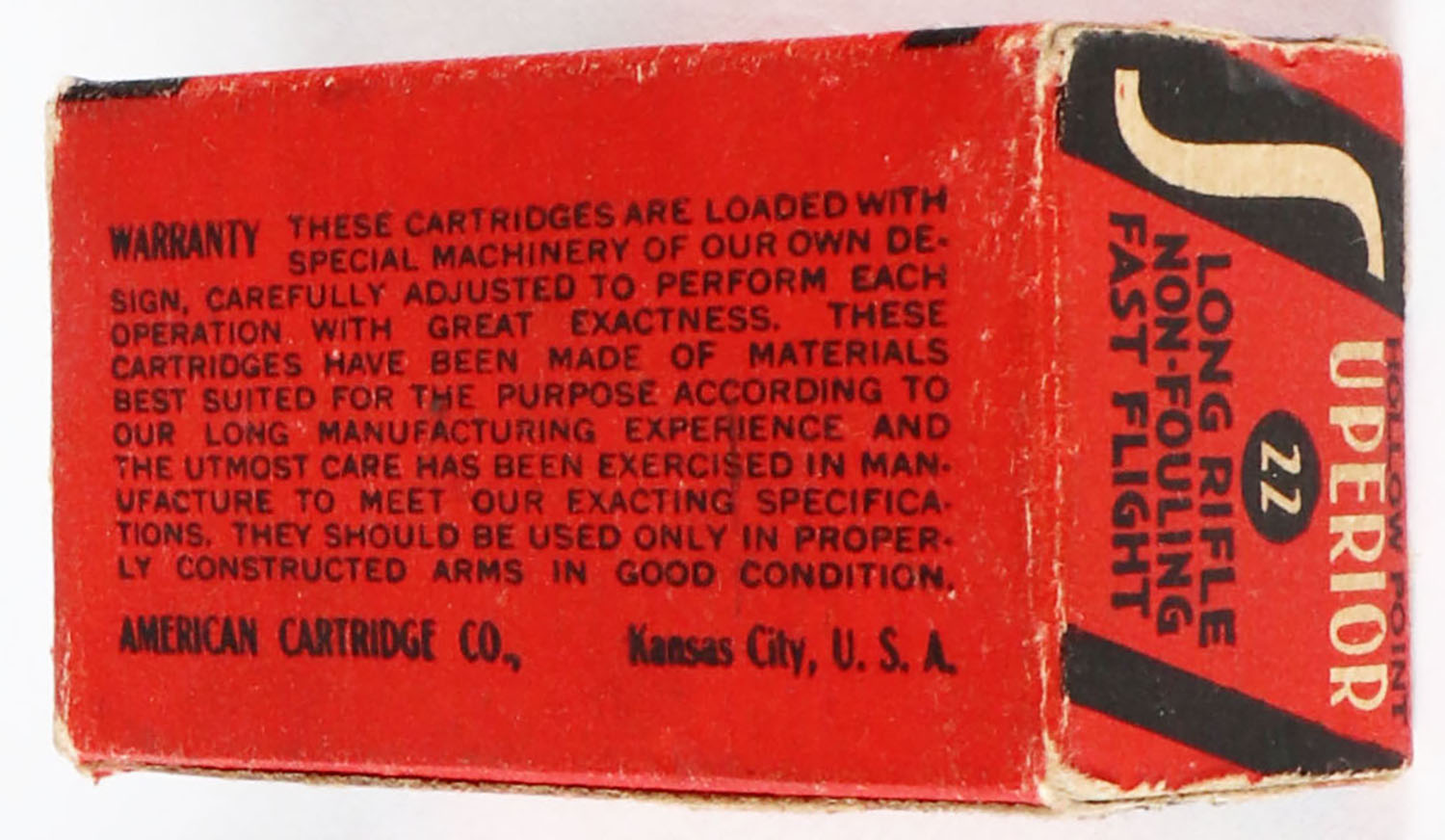 American, Superior Cartridges, .22 Long Rifle Hollow Point, Fast Flight, RHWeb: ACC-2 LR-3, Full, 1pc. Red black & white box, box is solid with very good color, some age soiling & corner wear, edges are mostly crisp, end flaps are solid, ammo is excellent. Grade: Excellent - Value: 10 to 50
