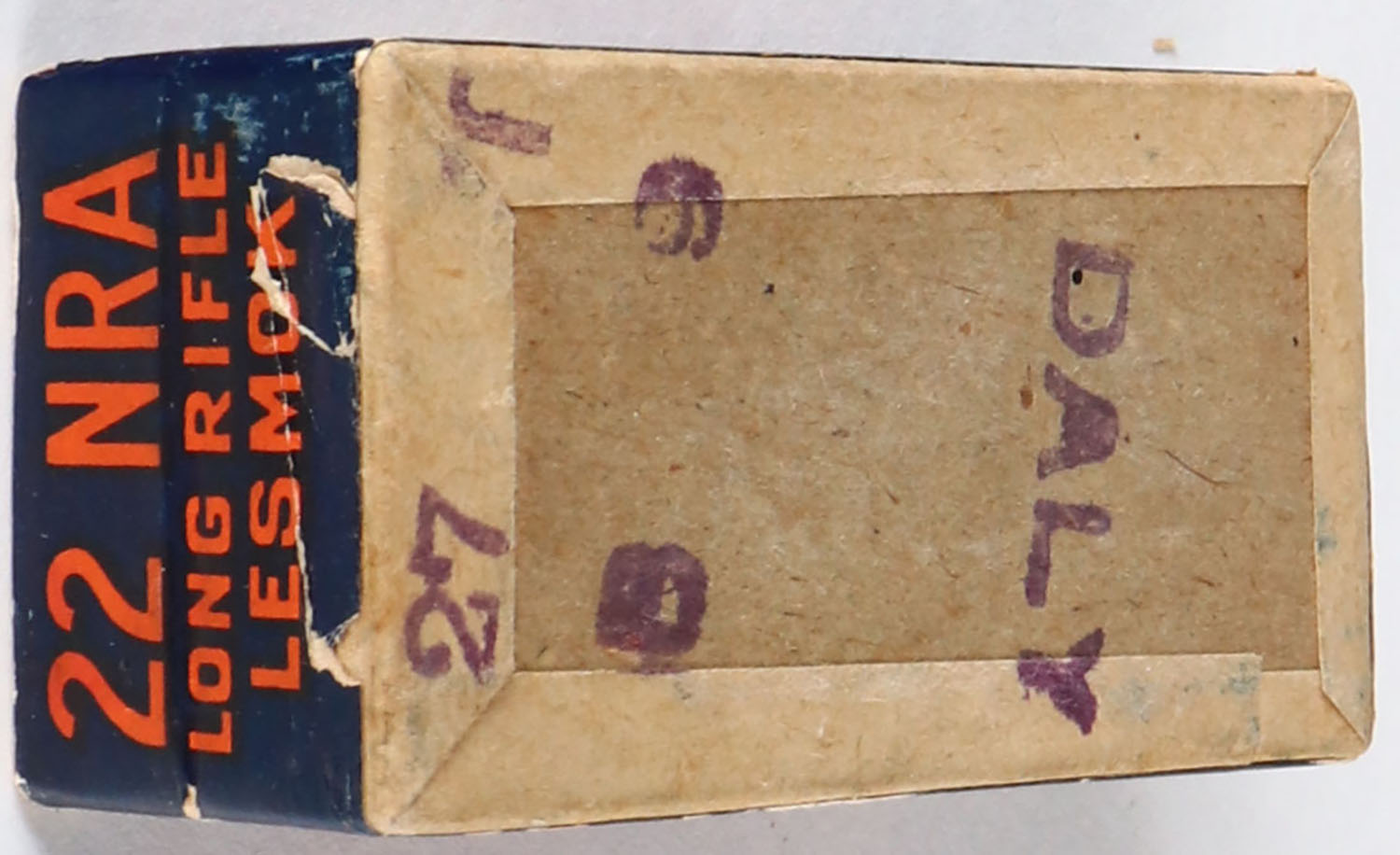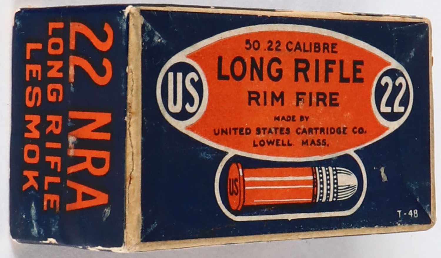 U.S., 22 NRA, .22 Long Rifle, Lesmok, RHWeb: US-51 LR-5, FULL & SEALED, 2pc. Buff box with blue/orange top & side sealing labels, box is solid with excellent color, very minor age soiling & shelf wear, very minor edge & corner wear, labels are intact. Grade: Excellent - Value: 30 to 90