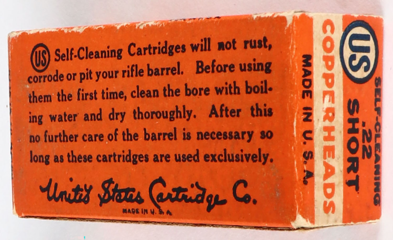 U.S., Copperheads, .22 Short, Self-Cleaning, RHWeb: US-12 S-1b, Full, 1pc. Orange white & blue box, box is solid with excellent color, minor age soiling, very minor corner wear, edges are crisp, end flaps are solid, ammo is excellent. Grade: Excellent + - Value: 30 to 90