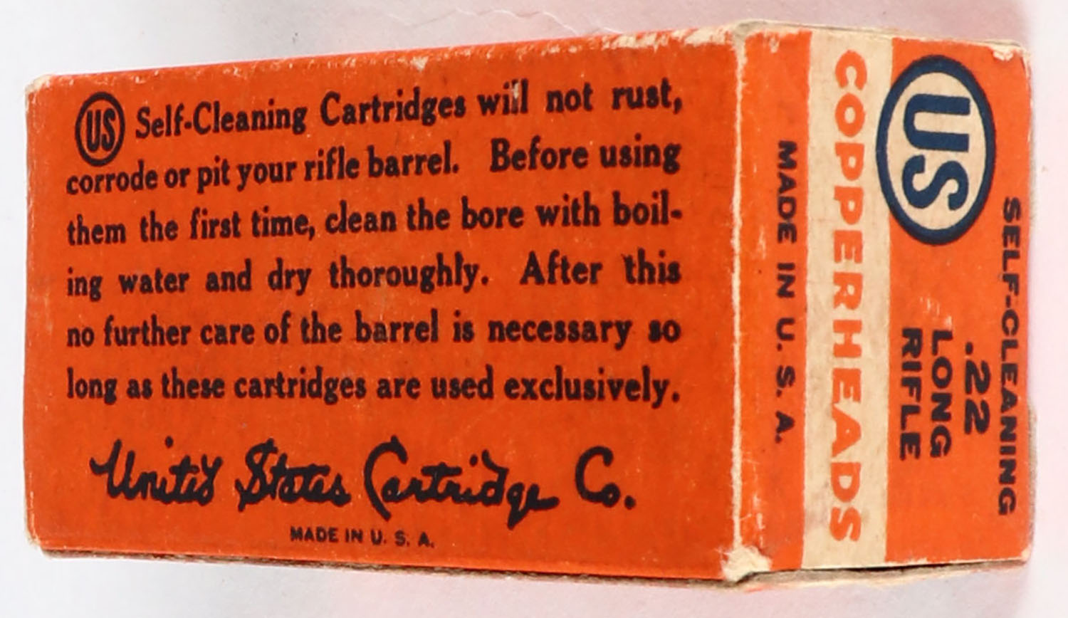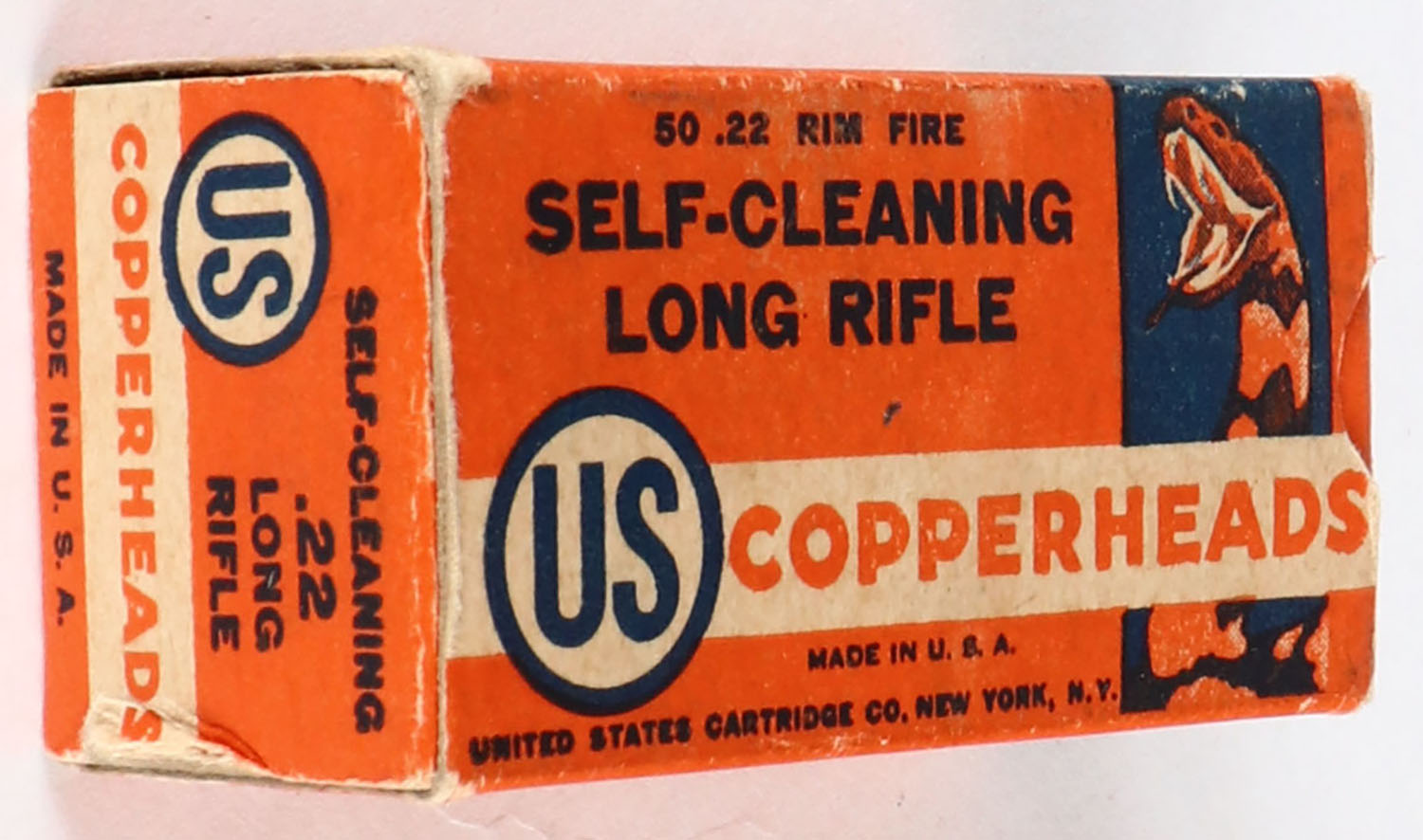 U.S., Copperheads, .22 Long Rifle, Self-Cleaning, RHWeb: US-12 LR-1b, Full, 1pc. Orange white & blue box, box is solid with excellent color, very minor age soiling & corner wear, edges are crisp, end flaps are solid, ammo is excellent. Grade: Excellent - Value: 20 to 60
