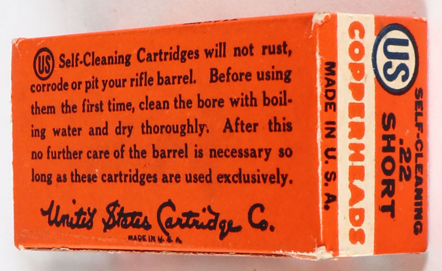 U.S., Copperheads, .22 Short, Self-Cleaning Lubricated, RHWeb: US-12 S-2b, Full, 1pc. Orange white & blue box, box is near mint with excellent color, only very minor age soiling & corner wear, edges are crisp, end flaps are solid, ammo is very good. Grade: Excellent ++ - Value: 40 to 160