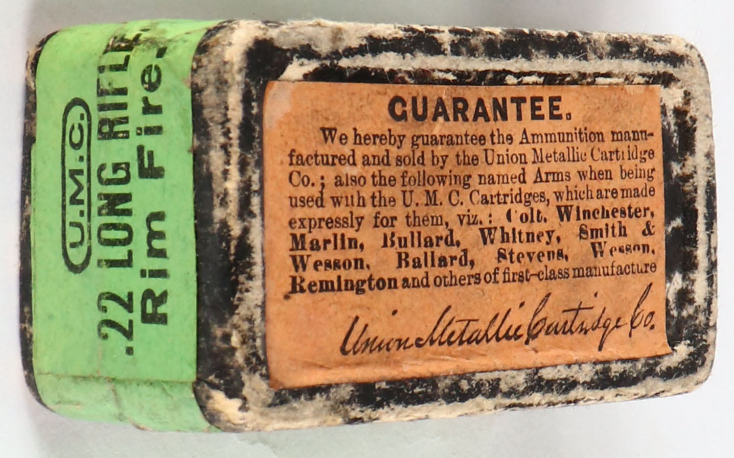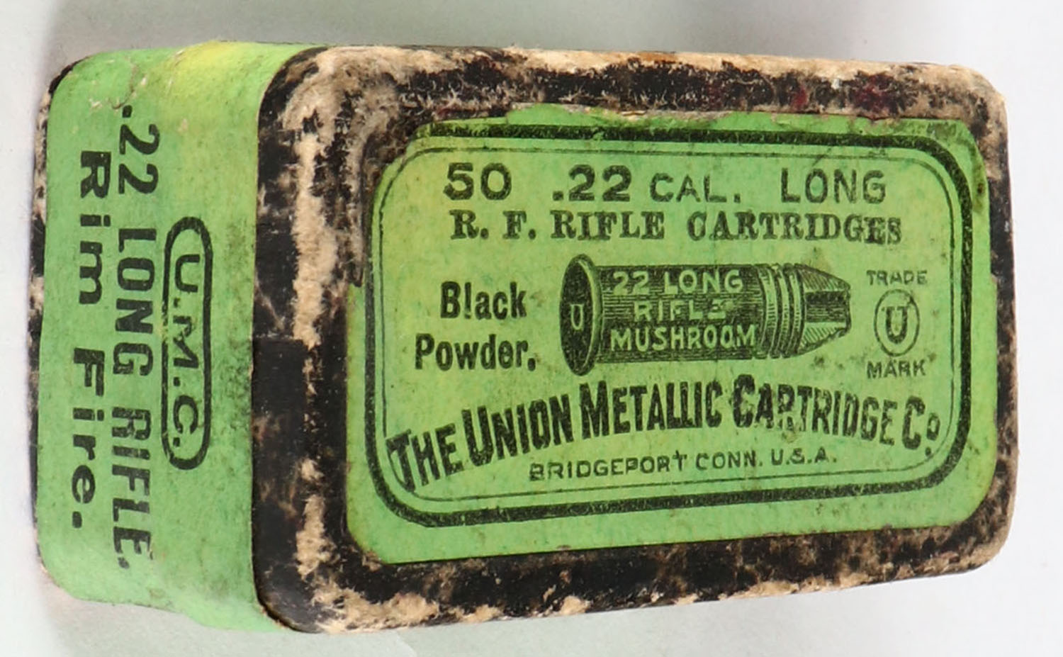 UMC, R.F. Rifle Cartridges, .22 Long Rifle Mushroom, Black Powder, RHWeb: UMC-8 LR-5, FULL & SEALED, 2pc. Black mottled box with green top & side sealing labels, box is solid with very good to excellent color, minor age soiling & color fading, some edge wear, labels are intact. Grade: Very Good + - Value: 100 to 400