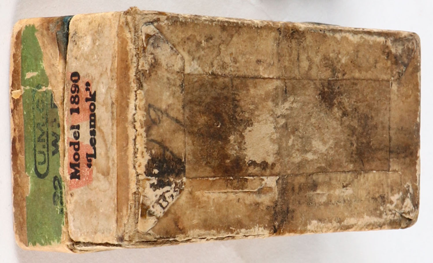 UMC, Rim-Fire Cartridges, .22 Winchester Rim Fire, Swaged Bullets, RHWeb: UMC-8.5 WRF-1, Full (unclear if this is correct ammo, copper case, no H/S), 2pc. Buff box with green top & side sealing labels, box bottom does not match (Winchester box with white side sealing label), box is solid with poor to fair color, age soiling, some shelf wear, edge & corner wear, side sealing label is 40% intact, ammo is excellent. Grade: Good - Value: 10 to 40