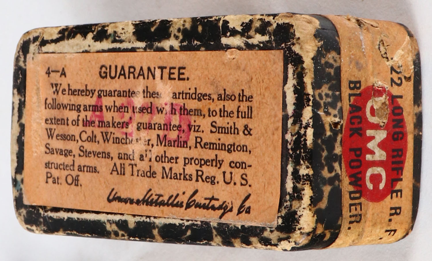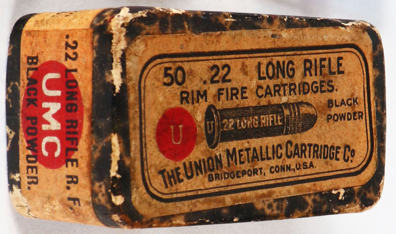 UMC, Rim Fire Cartridges, .22 Long Rifle, Black Powder, RHWeb: UMC-9 LR-1, FULL & SEALED, 2pc. Black mottled box, box is solid with very good color, some age soiling, very minor shelf wear, minor edge & corner wear, labels are intact. Grade: Very Good ++ - Value: 50 to 200