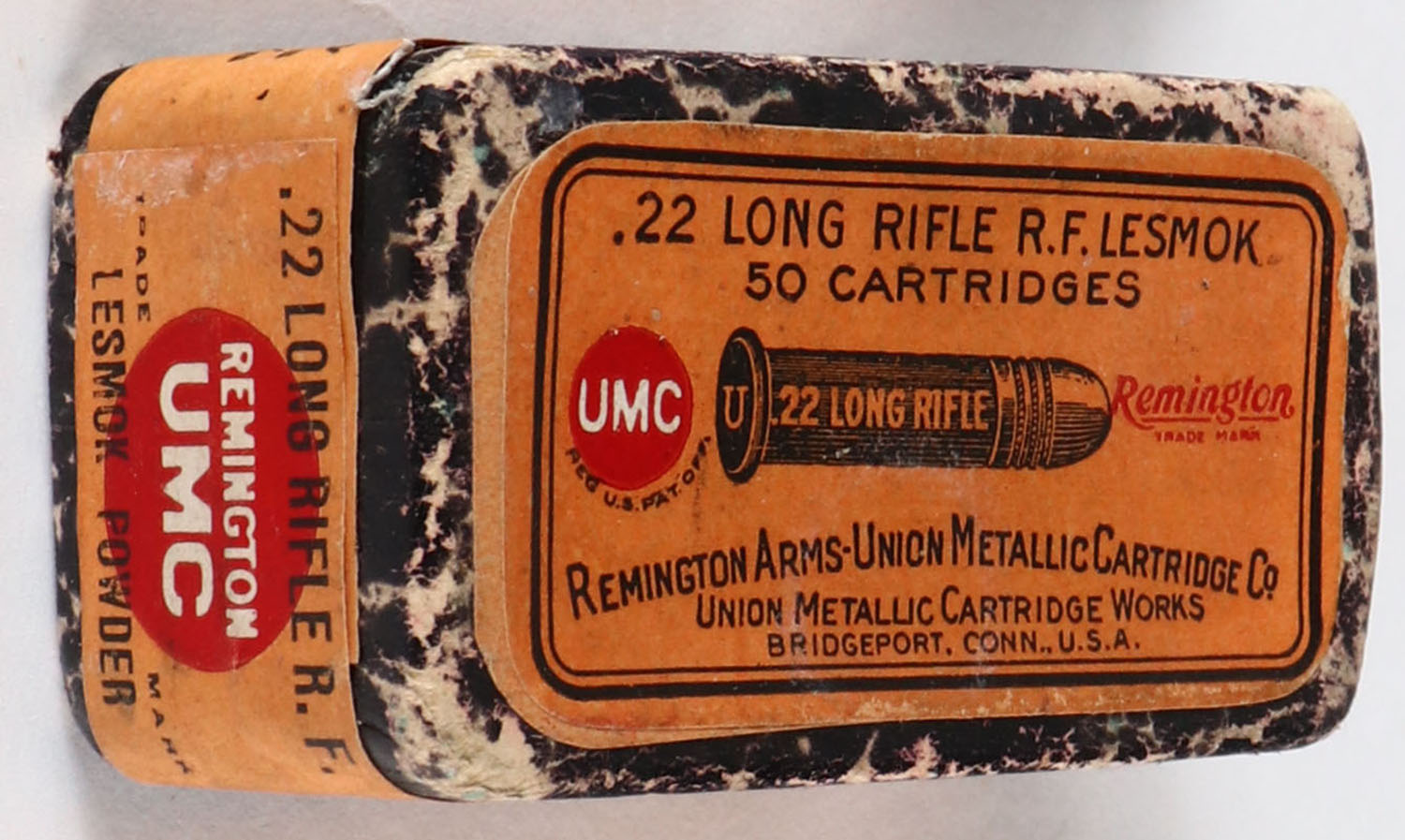 REM-UMC, R.F. Lesmok Cartridges, .22 Long Rifle, RHWeb: REM-1 LR-2A, FULL & SEALED, 2pc. Black mottled box with orange top & side sealing labels, box is solid with excellent color, very minor age soiling, some edge & corner wear, labels are intact. Grade: Excellent - Value: 40 to 200