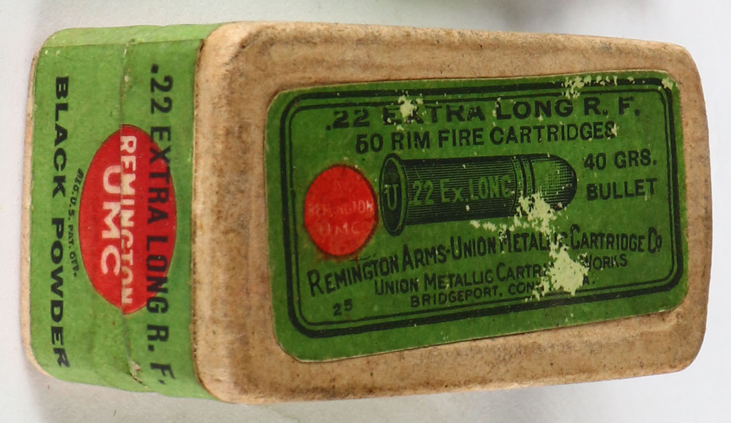 REM-UMC, Rim Fire Cartridges, .22 Extra Long, RHWeb: REM-2 XL-1B, FULL & SEALED, 2pc. Buff box with green top & side sealing labels, box is solid with very good color, some age soiling & shelf wear, very minor edge wear, labels are intact. Grade: Very Good ++ - Value: 200 to 600