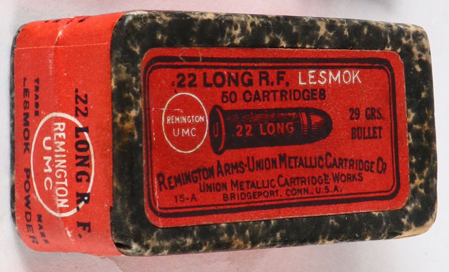 REM-UMC, R.F. Lesmok Cartridges, .22 Long, RHWeb: REM-2 L-2C, FULL & SEALED, 2pc. Black mottled box with red top & side sealing labels, box is solid with excellent color, some corner wear on 1 corner, corners are otherwise sharp, edges are crisp, labels are intact. Grade: Excellent ++ - Value: 50 to 150