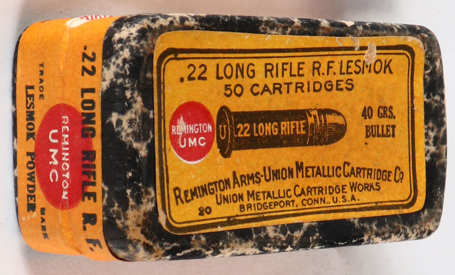 REM-UMC, R.F. Lesmok Cartridges, .22 Long Rifle, RHWeb: REM-2 LR-1E, FULL & SEALED, 2pc. Black mottled box with orange top & side sealing labels, box is solid with excellent color, very minor chipping to top label, very minor corner wear, edges are crisp, labels are intact. Grade: Excellent ++ - Value: 100 to 400