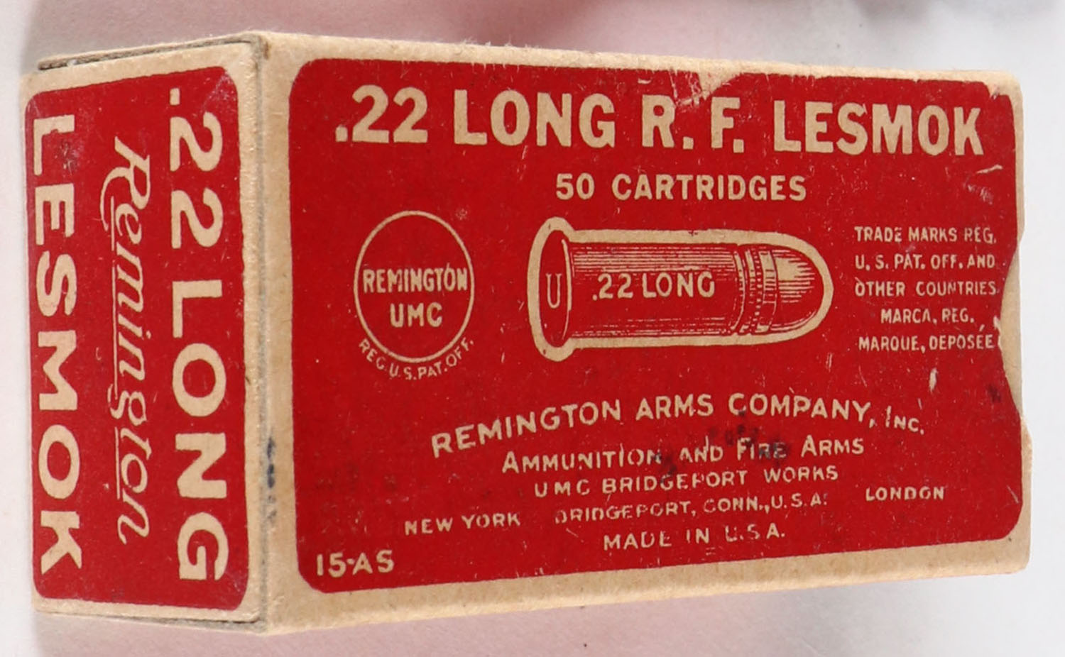 REM-UMC, R.F. Lesmok Cartridges, .22 Long, RHWeb: REM-6 L-2A, Full, 1pc. Red & buff box, box is solid with excellent color, very minor shelf wear, corners are sharp, edges are crisp, end flaps are solid, ammo is fair. Grade: Excellent + - Value: 10 to 50