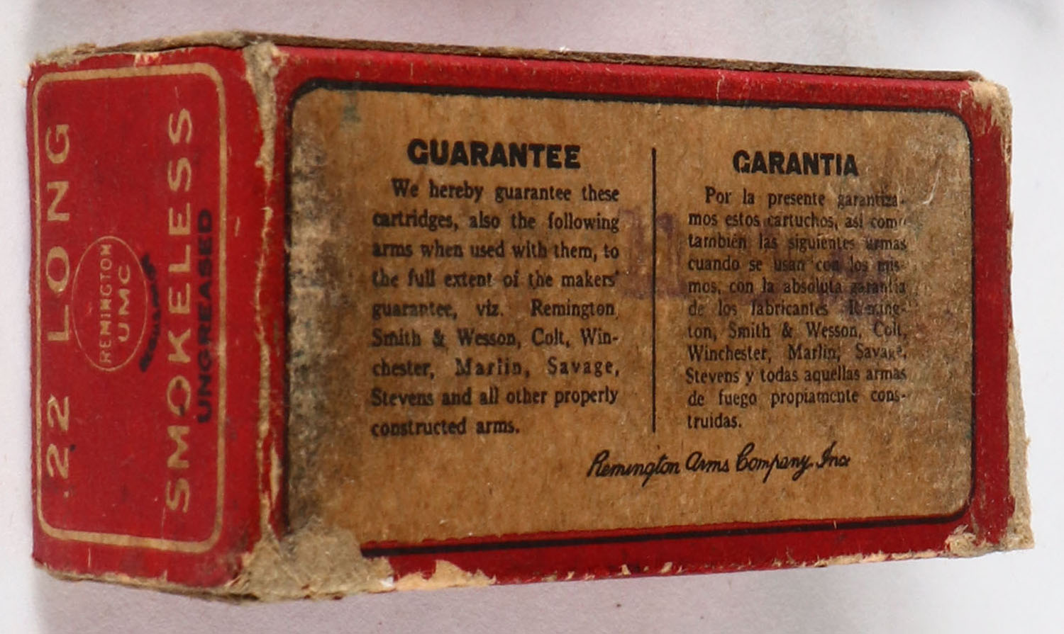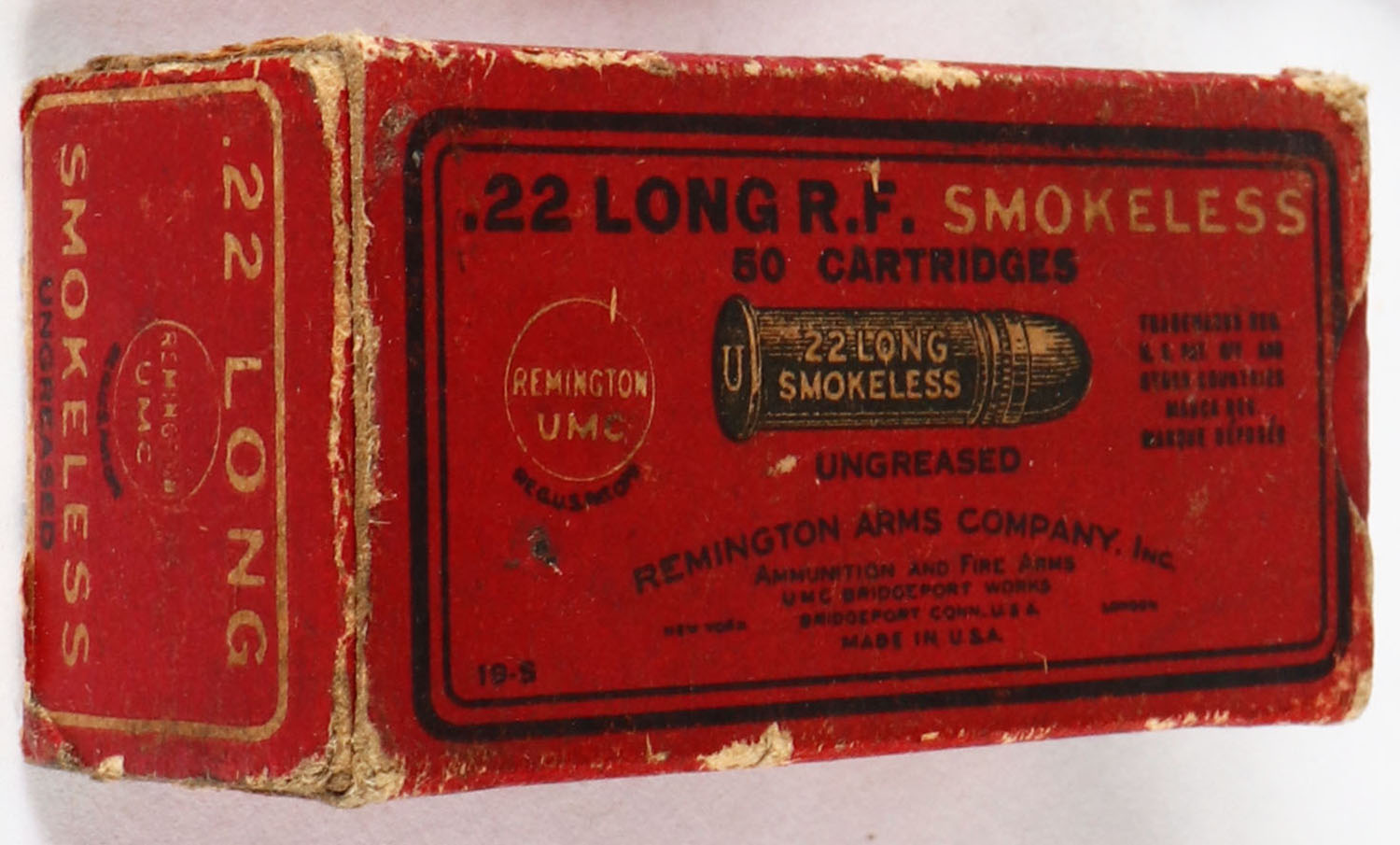 REM-UMC, R.F. Smokeless Cartridges, .22 Long, RHWeb: REM-6 L-5A, Full, 1pc. Red black & white box, left end is torn, very good color, some age soiling, some edge & corner wear, right end flap is solid, ammo is very good. Grade: Good ++ - Value: 10 to 50