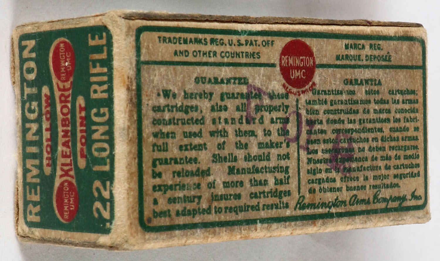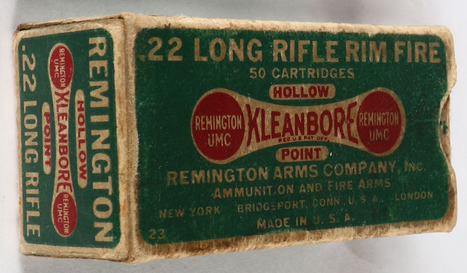 Remington, Kleanbore, .22 Long Rifle Hollow Point, RHWeb: REM-7.1A LR-2a, Partial 27rds. 1pc. Green buff & red dog bone box, box is solid with very good color, age soiling, some edge & corner wear, end flaps are solid, ammo is very good. Grade: Very Good - Value: 6 to 30