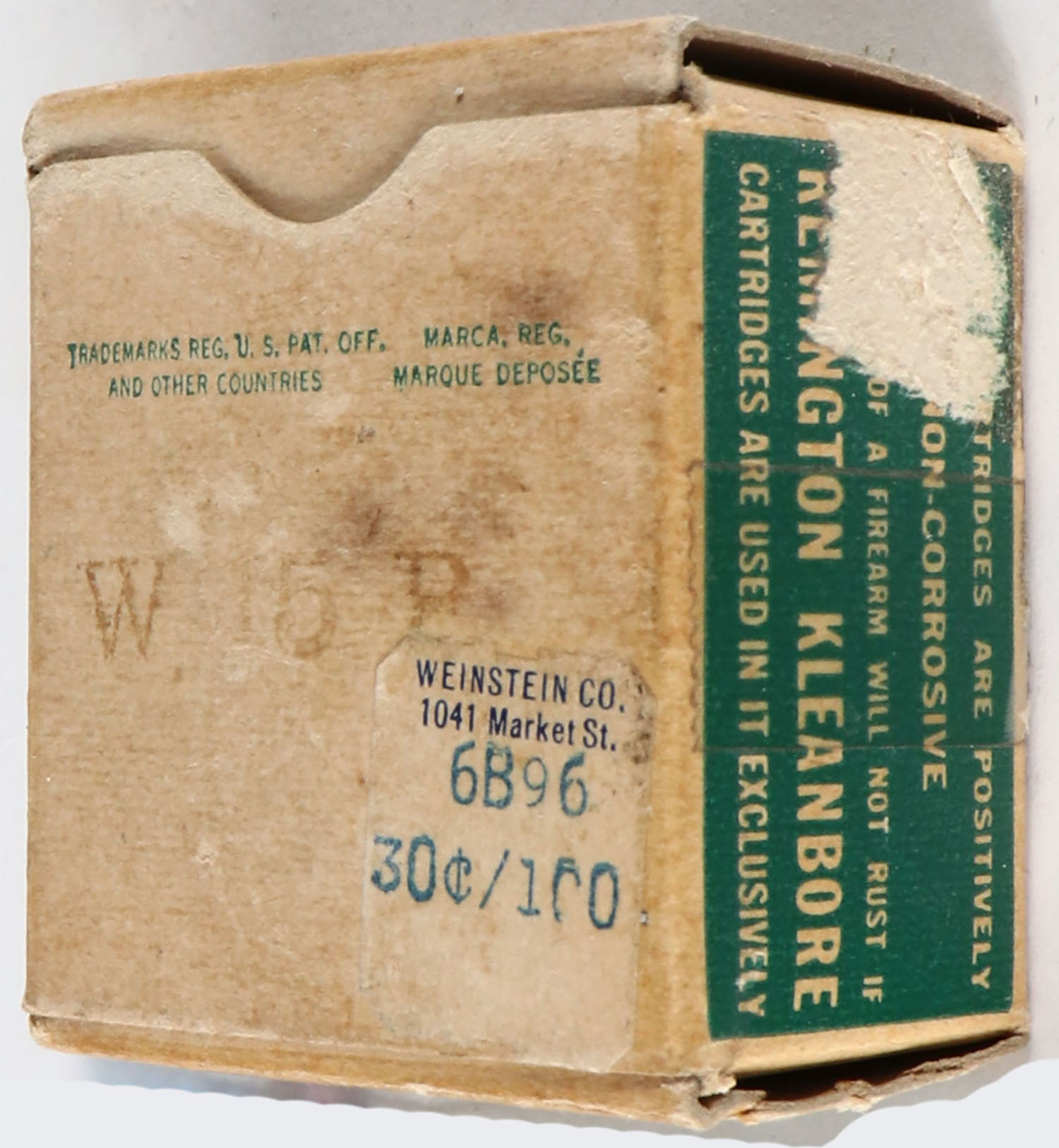 Remington, Kleanbore, B.B. Caps, RHWeb: REM-7.1B BB-1c, Full, 1pc. Green buff & red dog bone box, box is solid with excellent color, minor corner wear, edges are mostly crisp, flaps are solid, tape on left end, ammo is very good. Grade: Excellent + - Value: 30 to 90