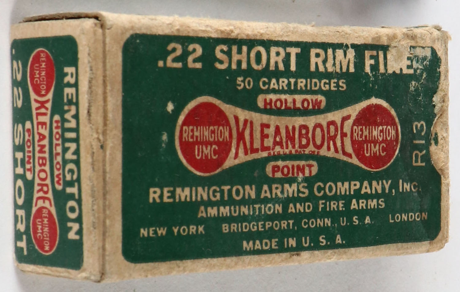 Remington, Kleanbore, .22 Short Hollow Point, RHWeb: REM-7.1B S-2, Full, 1pc. Green buff & red dog bone box, box is solid with very good to excellent color, minor age soiling, some shelf wear, very minor corner wear, edges are crisp, end flaps are solid, ammo is good. Grade: Very Good + - Value: 40 to 160