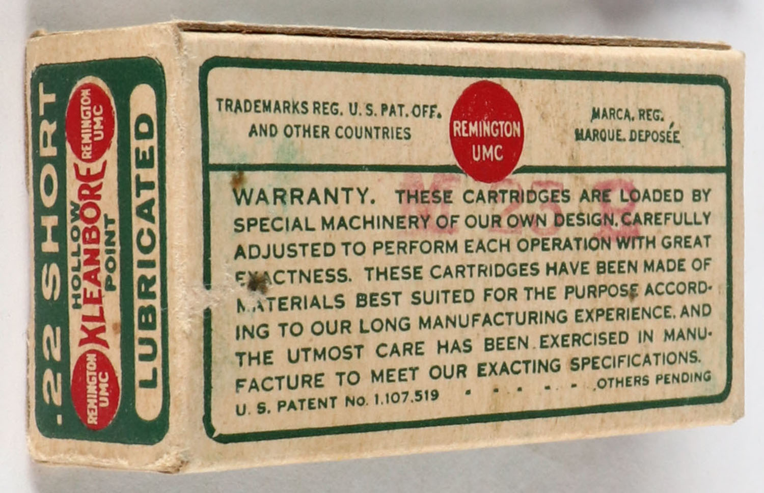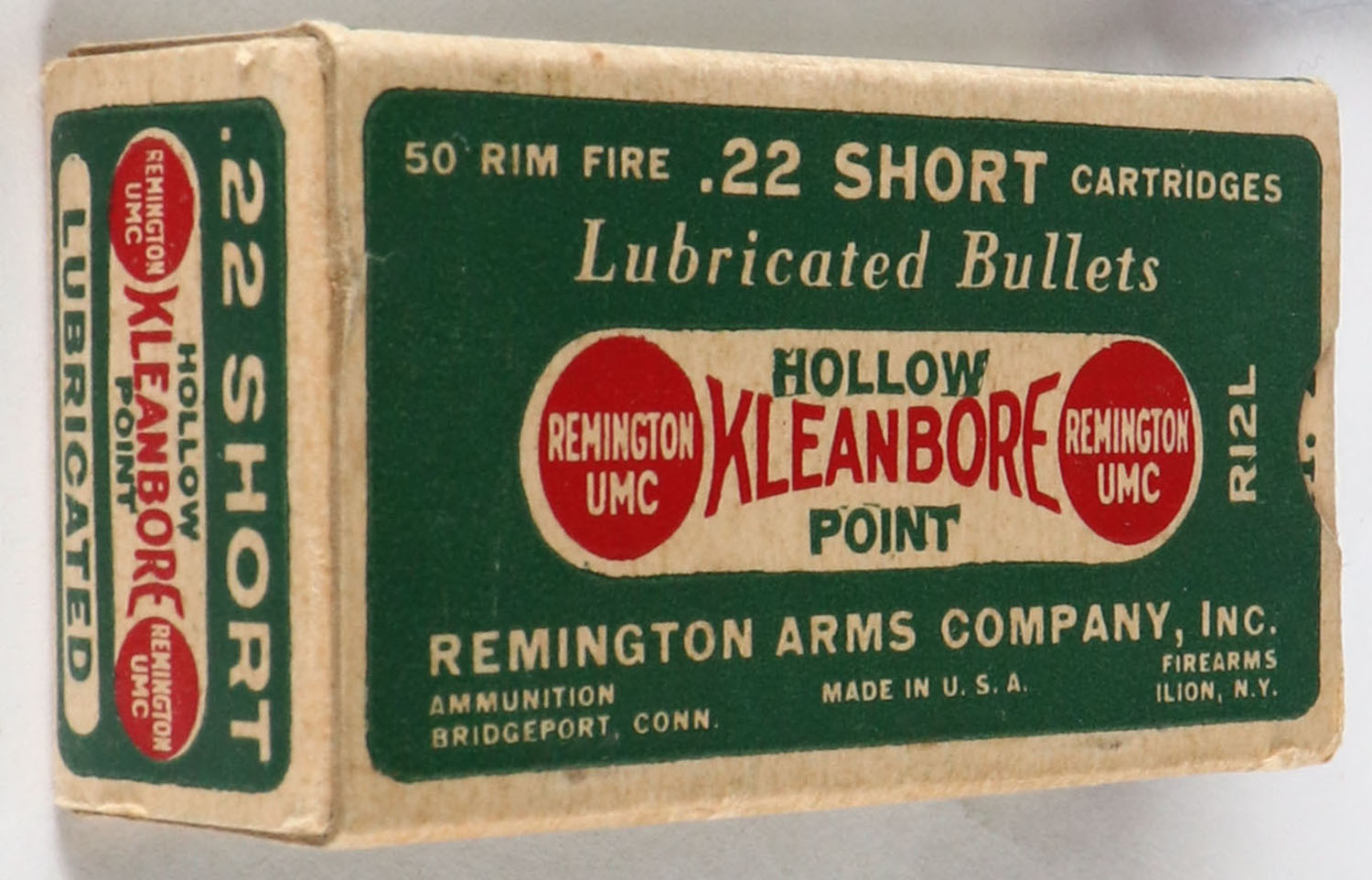 Remington, Kleanbore, .22 Short Hollow Point, RHWeb: REM-7.2 S-3a, Full, 1pc. Green buff & red dog bone box, box is solid with excellent color, very minor age soiling & corner wear, edges are crisp, end flaps are solid, ammo is excellent. Grade: Excellent + - Value: 30 to 90