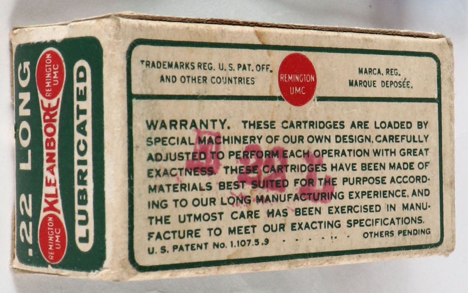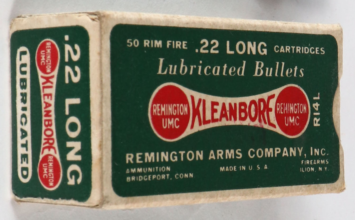 Remington, Kleanbore, .22 Long, RHWeb: REM-7.2 L-1e, Full, 1pc. Green buff & red dog bone box, box is solid with excellent to minty color, very minor edge & corner wear, end flaps are solid, ammo is very good to excellent. Grade: Excellent ++ - Value: 10 to 40