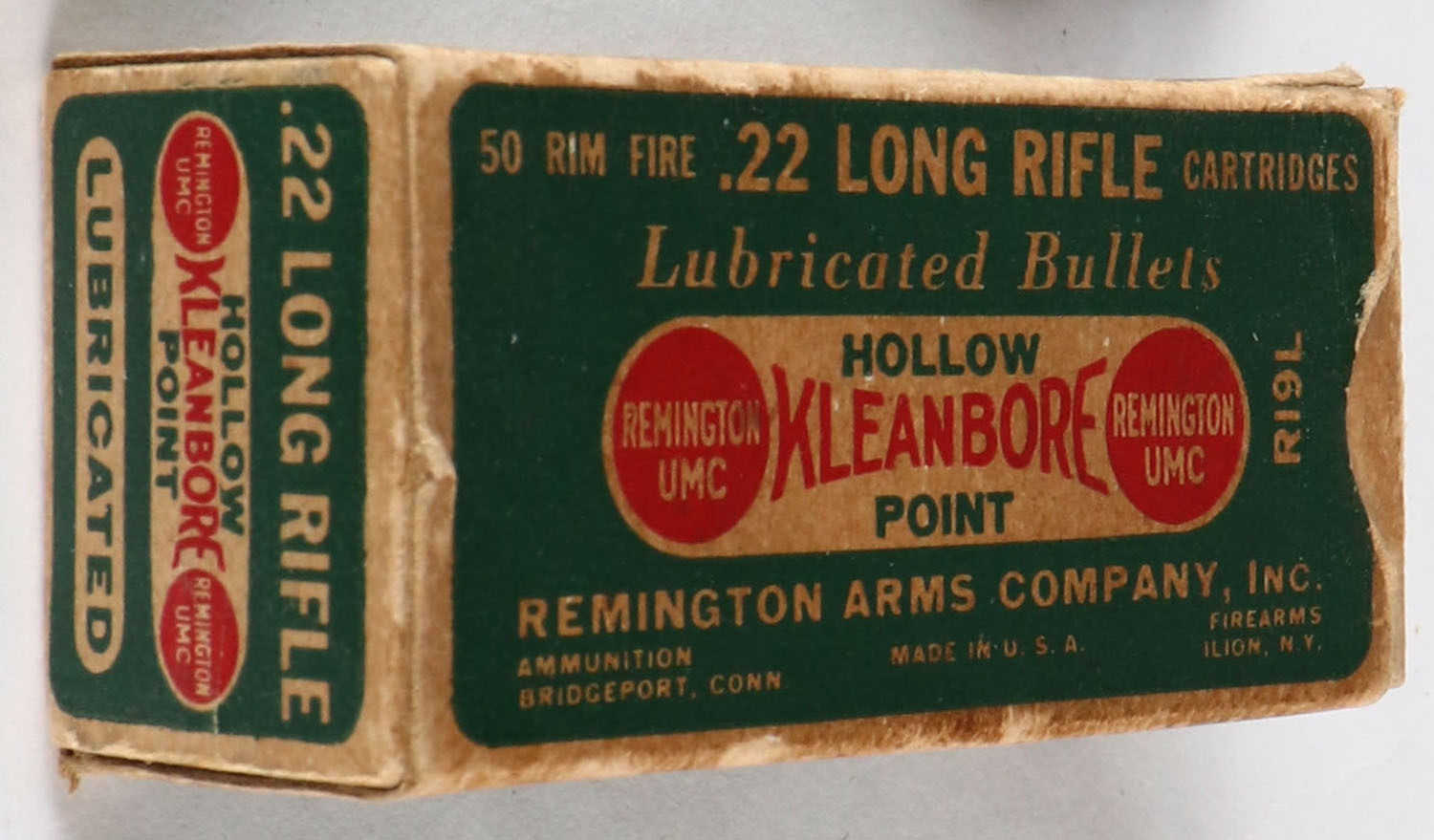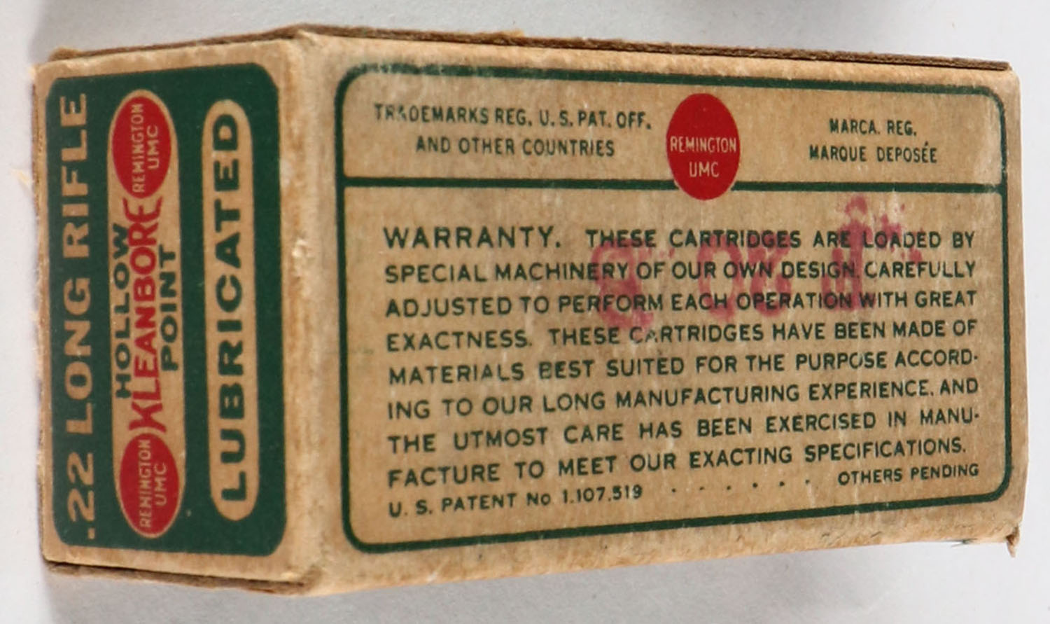 Remington, Kleanbore, .22 Long Rifle Hollow Point, RHWeb: REM-7.2 LR-4a, Full, 1pc. Green buff & red dog bone box, box is solid with very good color, some age soiling & corner wear, very minor edge wear, end flaps are solid, ammo is very good. Grade: Very Good + - Value: 10 to 40