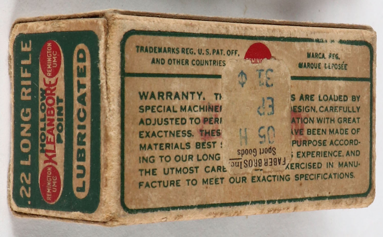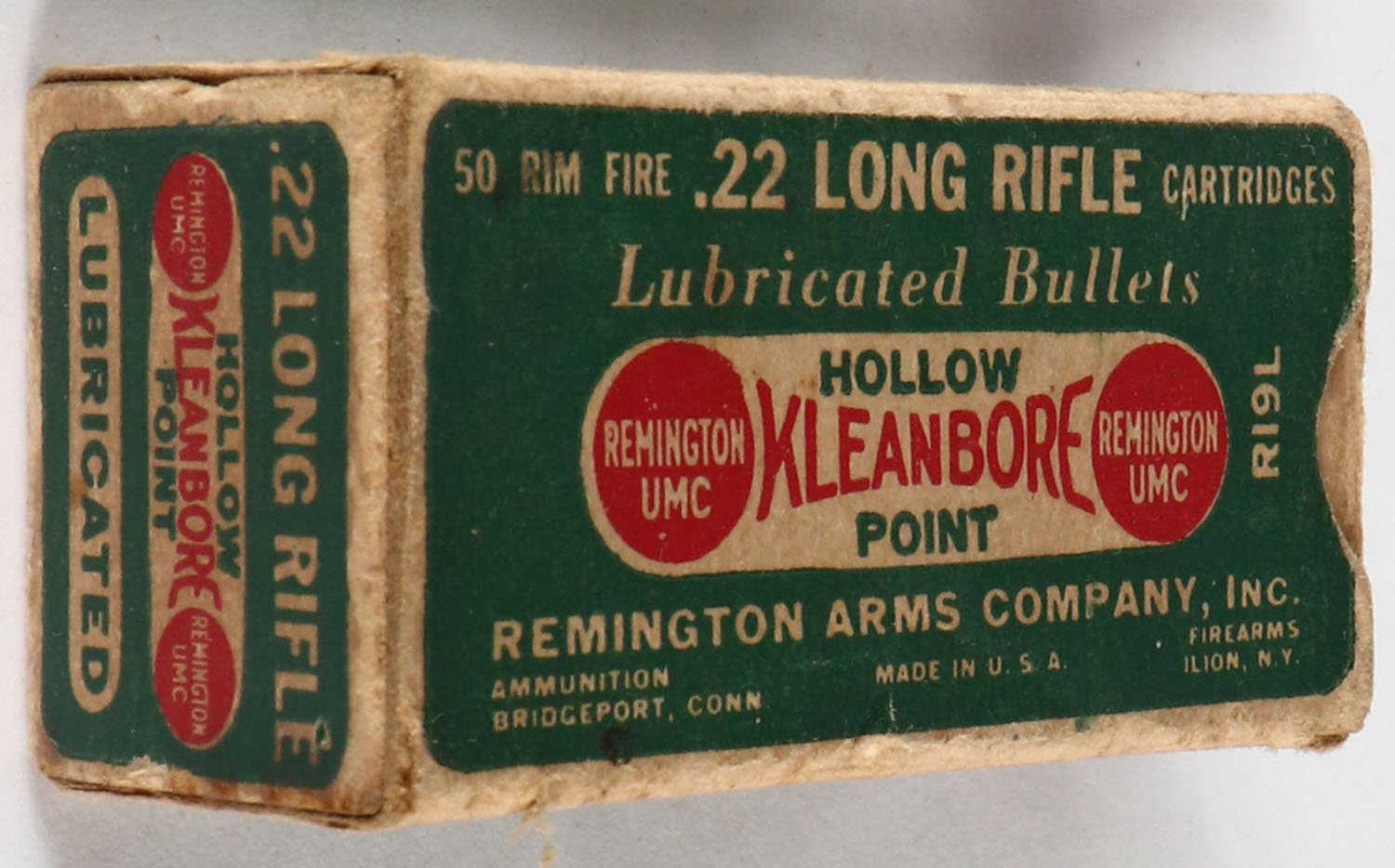 Remington, Kleanbore, .22 Long Rifle Hollow Point, RHWeb: REM-7.2 LR-4c, Partial 36rds. 1pc. Green buff & red dog bone box, box is solid with very good color, some age soiling & corner wear, minor edge wear, end flaps are solid, ammo is very good. Grade: Very Good - Value: 4 to 20