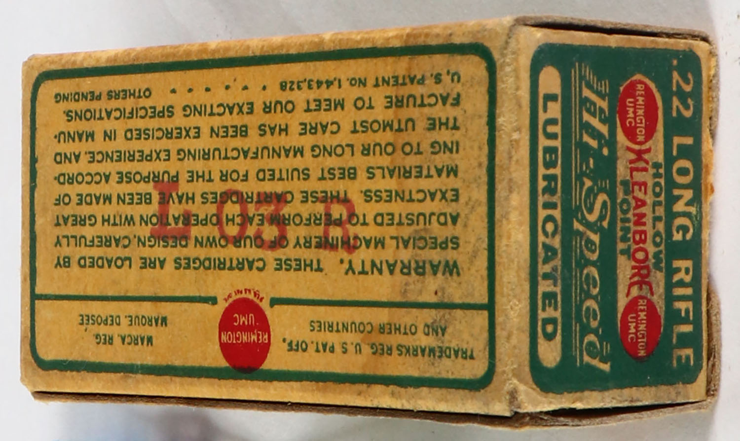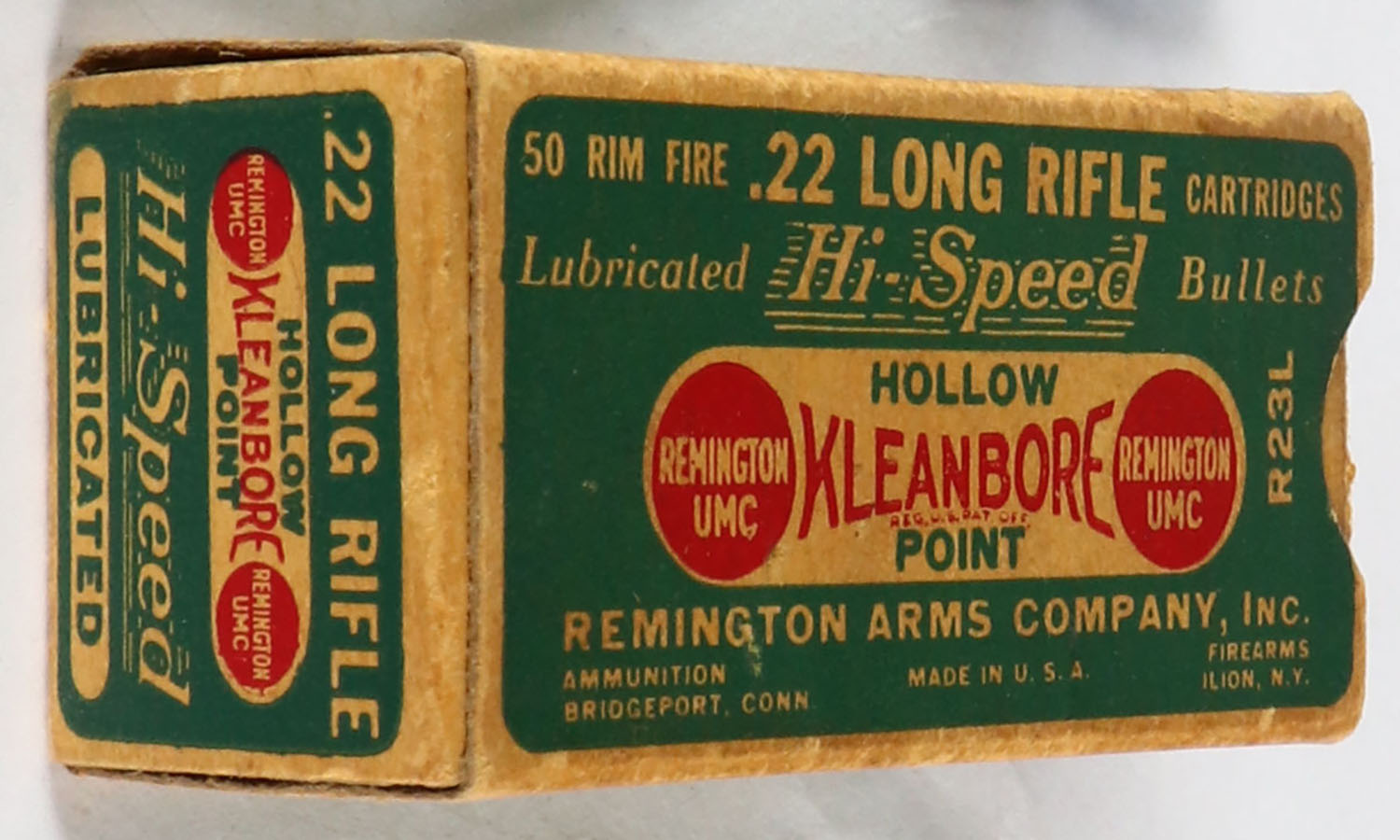 Remington, Kleanbore Hi-Speed, .22 Long Rifle Hollow Point, RHWeb: REM-7.4 LR-3g, Partial 45rds. 1pc. Green buff & red dog bone box, box is solid with excellent color, minor age soiling & corner wear, very minor edge wear, end flaps are solid, ammo is good. Grade: Very Good ++ - Value: 6 to 30