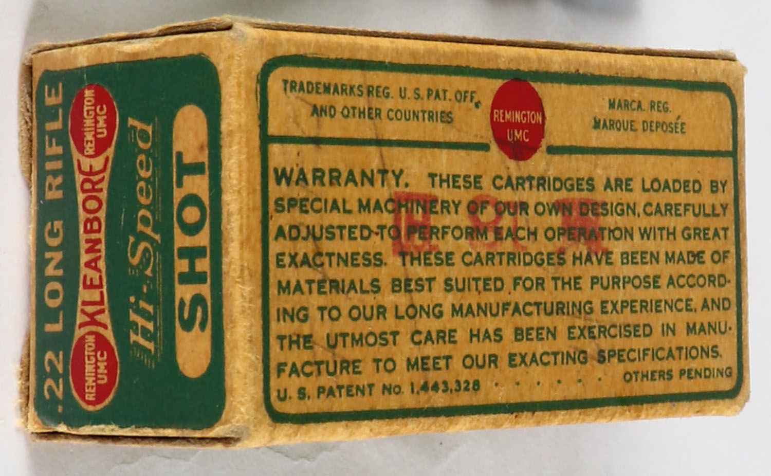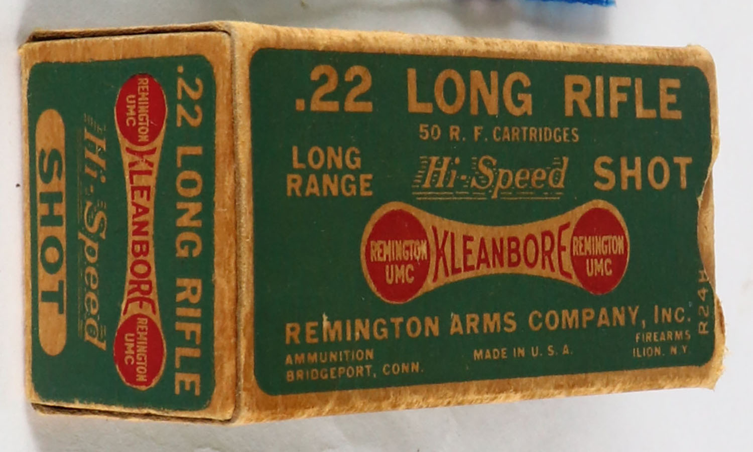 Remington, Kleanbore Hi-Speed, .22 Long Rifle Shot, RHWeb: REM-7.4, Full, 1pc. Green buff & red dog bone box, box is solid with very good color, some age soiling & corner wear, very minor edge wear, end flaps are solid, ammo is excellent. Grade: Very Good + - Value: 20 to 80