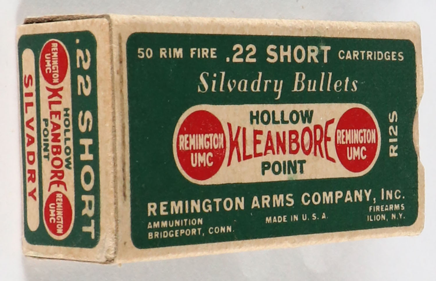 Remington, Silvadry Kleanbore, .22 Short, RHWeb: REM-7.3 S-1, Empty, 1pc. Green buff & red dog bone box, box is solid with excellent color, very minor corner wear, edges are crisp, end flaps are solid. Grade: Excellent ++ - Value: 6 to 30