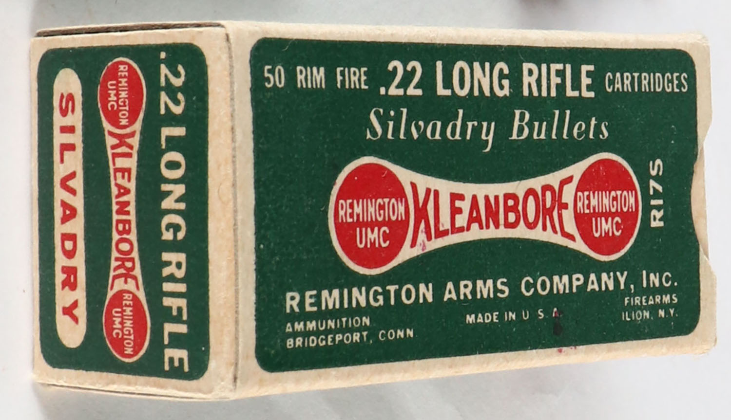 Remington, Silvadry Kleanbore, .22 Long Rifle, RHWeb: 7.3 LR-1, Full, 1pc. Green buff & red dog bone box, box is solid with excellent to minty color, very minor corner wear, edges are crisp, end flaps are solid, ammo is excellent to minty. Grade: Excellent ++ - Value: 20 to 60