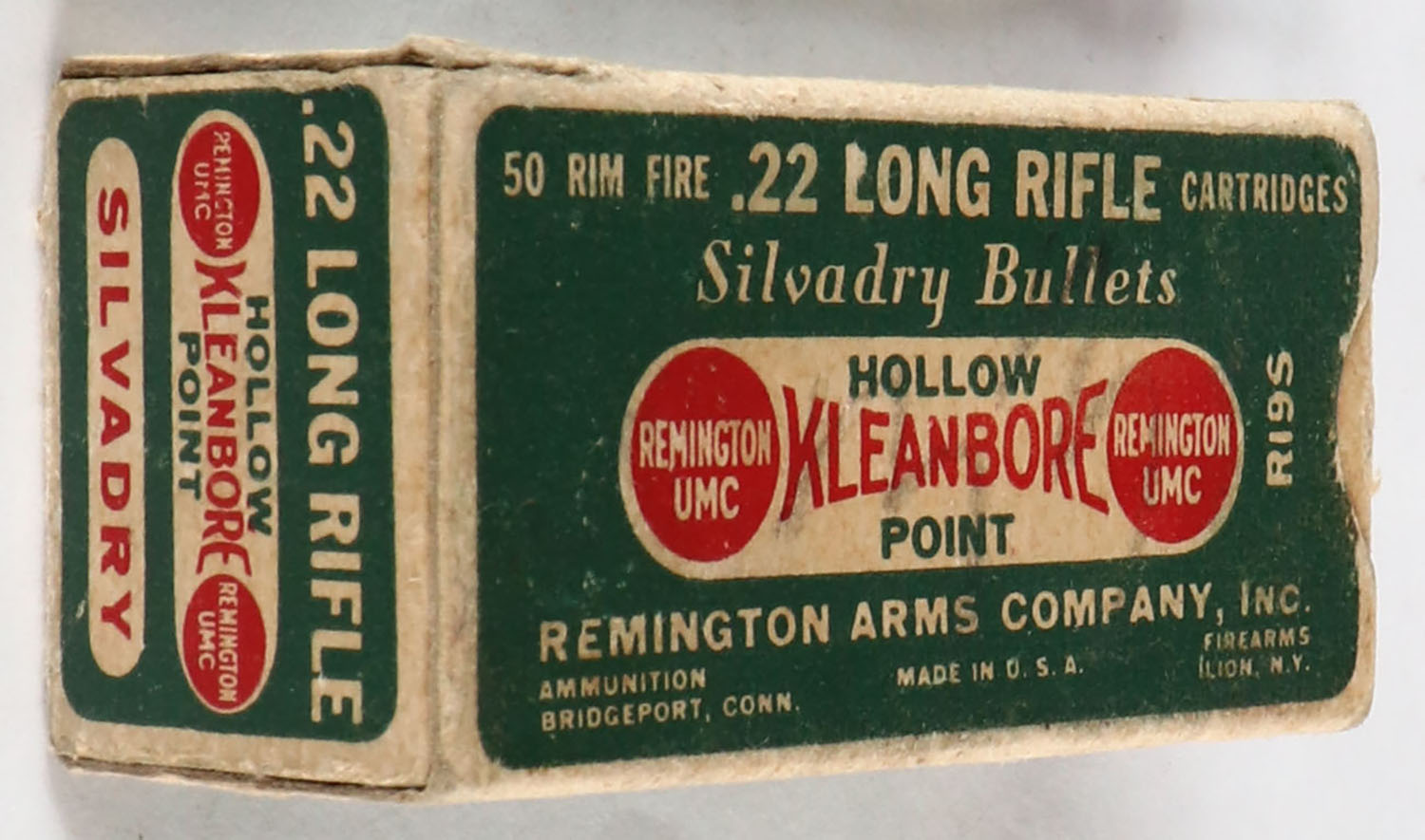 Remington, Silvadry Kleanbore, .22 Long Rifle Hollow Point, RHWeb: REM-7.3 LR-2, Full, 1pc. Green buff & red dog bone box, right end flap is torn, very good to excellent color, very minor age soiling, some shelf & corner wear, minor edge wear, left end flap is solid, ammo is very good. Grade: Very Good + - Value: 40 to 120