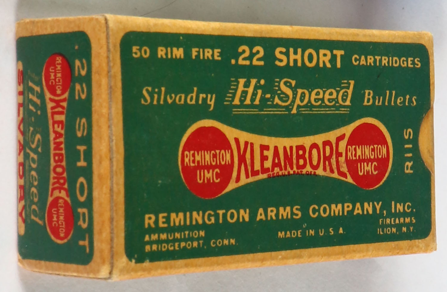 Remington, Silvadry Hi-Speed, .22 Short, RHWeb: REM-7.5 S-1c, Full, 1pc. Green buff & red dog bone box, box is solid with excellent color, very minor age soiling, corners are mostly sharp, edges are crisp, end flaps are solid, ammo is excellent. Grade: Excellent + - Value: 20 to 60