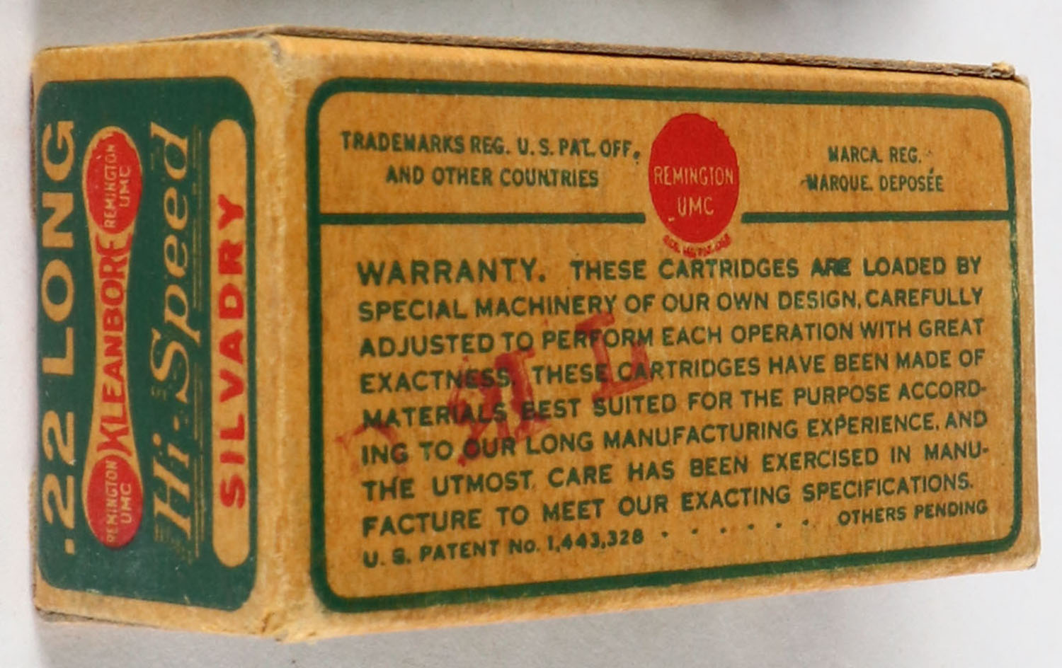Remington, Silvadry Hi-Speed, .22 Long, RHWeb: REM-7.5 L-1a, Full, 1pc. Green buff & red dog bone box, box is solid with very good color, some age soiling, minor corner wear, edges are mostly crisp, end flaps are solid, ammo is very good. Grade: Very Good ++ - Value: 20 to 60