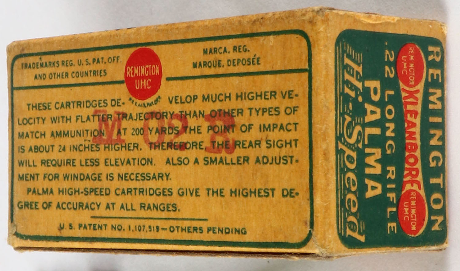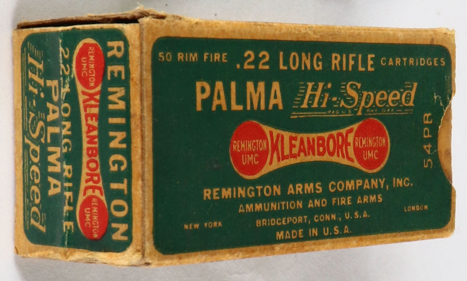 Remington, Palma Hi-Speed, .22 Long Rifle, RHWeb: REM-52 LR-11b, Full, 1pc. Green buff & red dog bone box, box is solid with very good color, some age soiling & shelf wear, minor edge wear, end flaps are solid, ammo is excellent. Grade: Very Good ++ - Value: 8 to 40