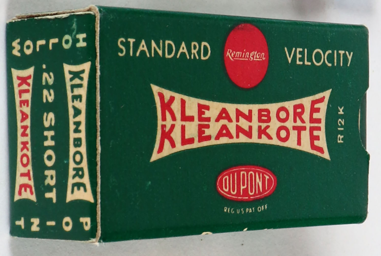 Remington, Kleanbore Kleankote, .22 Short Hollow Point, Standard Velocity, RHWeb: REM-9 S-3c, Full, 1pc. Green white & red box, box is solid with excellent color, very minor corner wear, edges are crisp, end flaps are solid, ammo is excellent. Grade: Excellent ++ - Value: 30 to 90