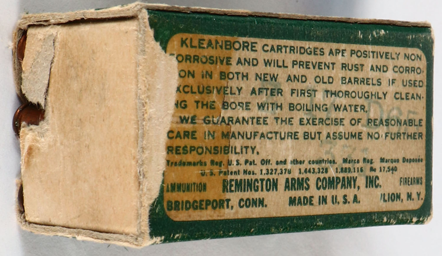 Remington, Kleanbore Kleankote, .22 Extra Long, Standard Velocity, RHWeb: REM-9 XL-1b, Full, 1pc. Green white & red box, missing right end flap, very good to excellent color, some age soiling & corner wear, minor edge wear, left end flap is solid, ammo is very good to excellent. Grade: Very Good - Value: 50 to 150