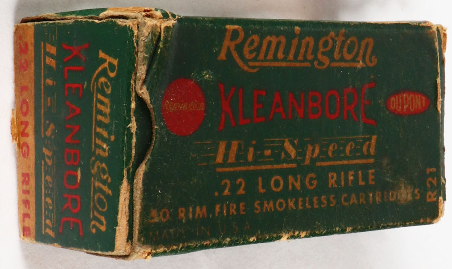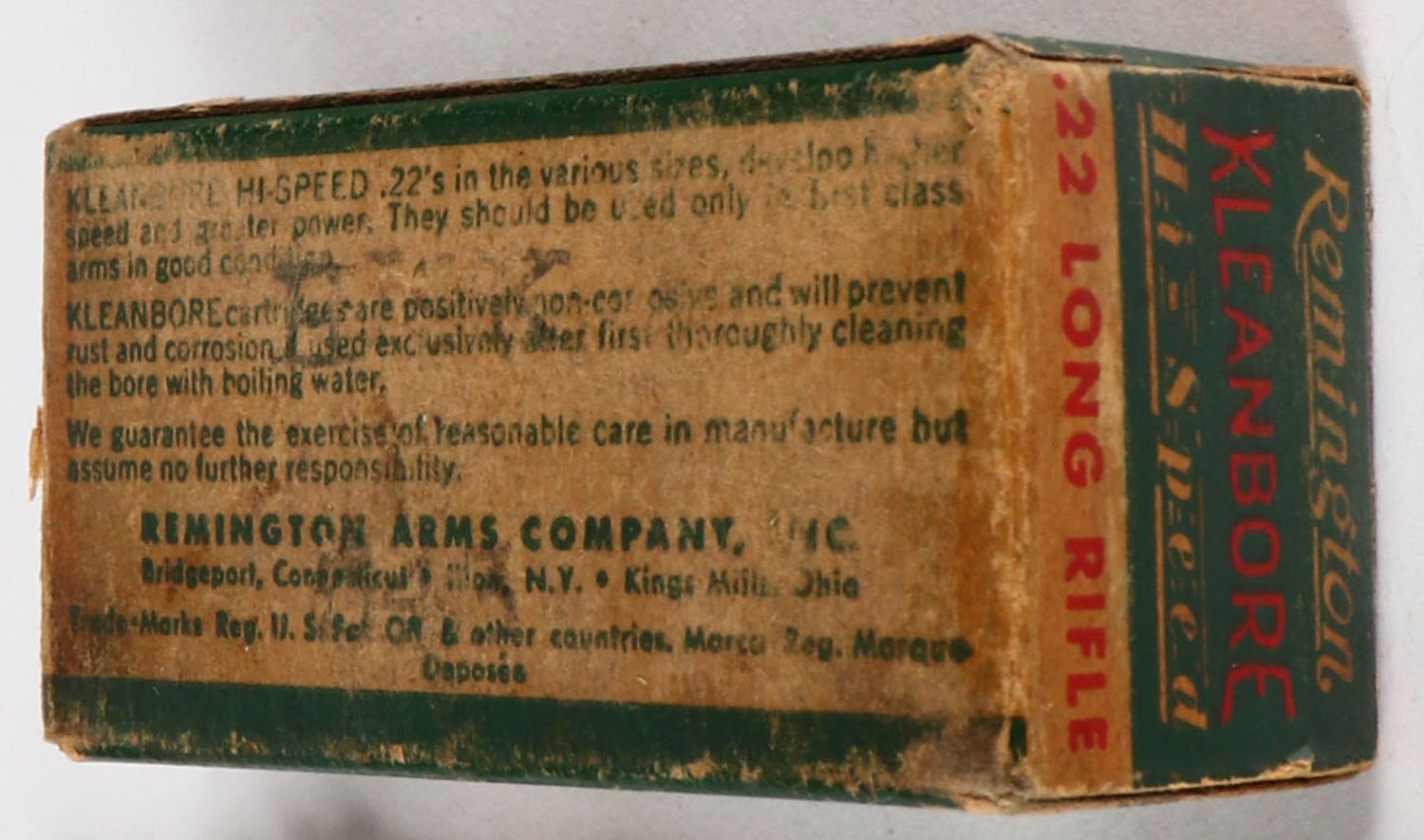 Remington, Kleanbore Hi-Speed, .22 Long Rifle, RHWeb: REM10 LR-1a, Full, 1pc. Green buff & red box, box is solid with fair to good color, age soiling, corner ding on top back corner, some corner wear, minor edge wear, end flaps are solid, ammo is excellent. Grade: Very Good - Value: 6 to 30