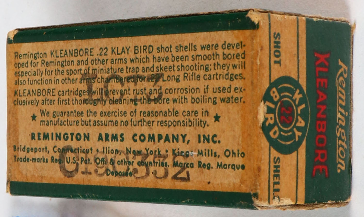 Remington, Kleanbore Hi-Speed, .22 Klay Bird, RHWeb: REM-10 LR-3a, Full, 1pc. Green buff & red box, box is solid with very good color, some age soiling n& corner wear, very minor edge wear, end flaps are solid, ammo is excellent. Grade: Very Good ++ - Value: 10 to 40