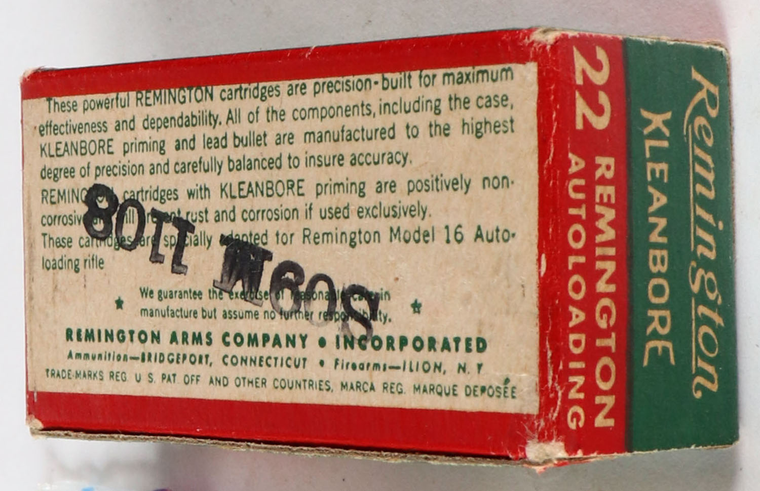 Remington, Kleanbore, .22 Remington Autoloading, RHWeb: REM-12 RA-1b, Full, 1pc. Green red & white box, box is solid with excellent color, minor age soiling, very minor corner wear, edges are crisp, end flaps are solid, ammo is very good to excellent. Grade: Excellent - Value: 40 to 120