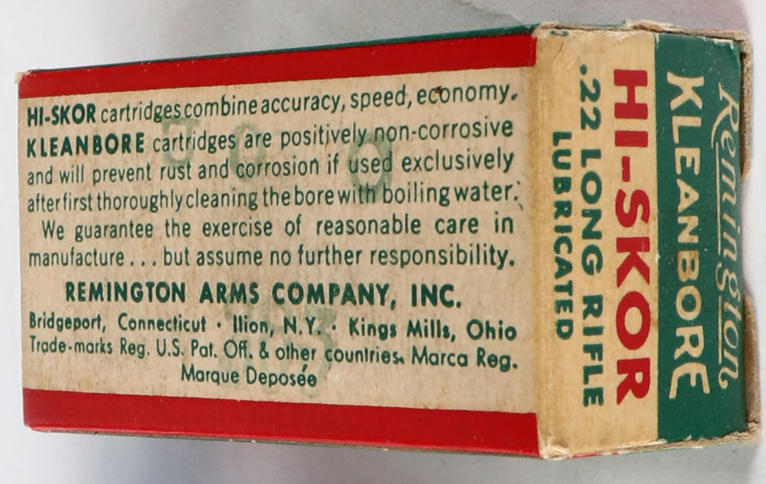 Remington, Hi-Skor Kleanbore, .22 Long Rifle, RHWeb: REM-53 LR-1b, Partial 47rds. 1pc. Green red & white box, box is solid with excellent color, very minor age soiling & corner wear, edges are crisp, end flaps are solid, ammo is very good to excellent. Grade: Excellent + - Value: 8 to 40