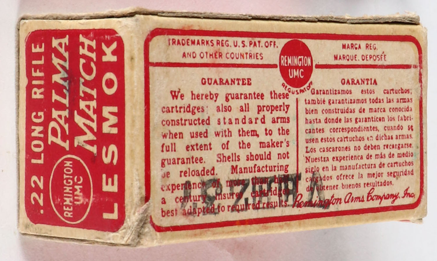 Remington, Palma Match, .22 Long Rifle, RHWeb: REM-52 LR-5b, Full, 1pc. Red & buff box, box is solid with excellent color, very minor age soiling & corner wear, edges are crisp, end flaps are solid, ammo is excellent. Grade: Excellent + - Value: 10 to 40