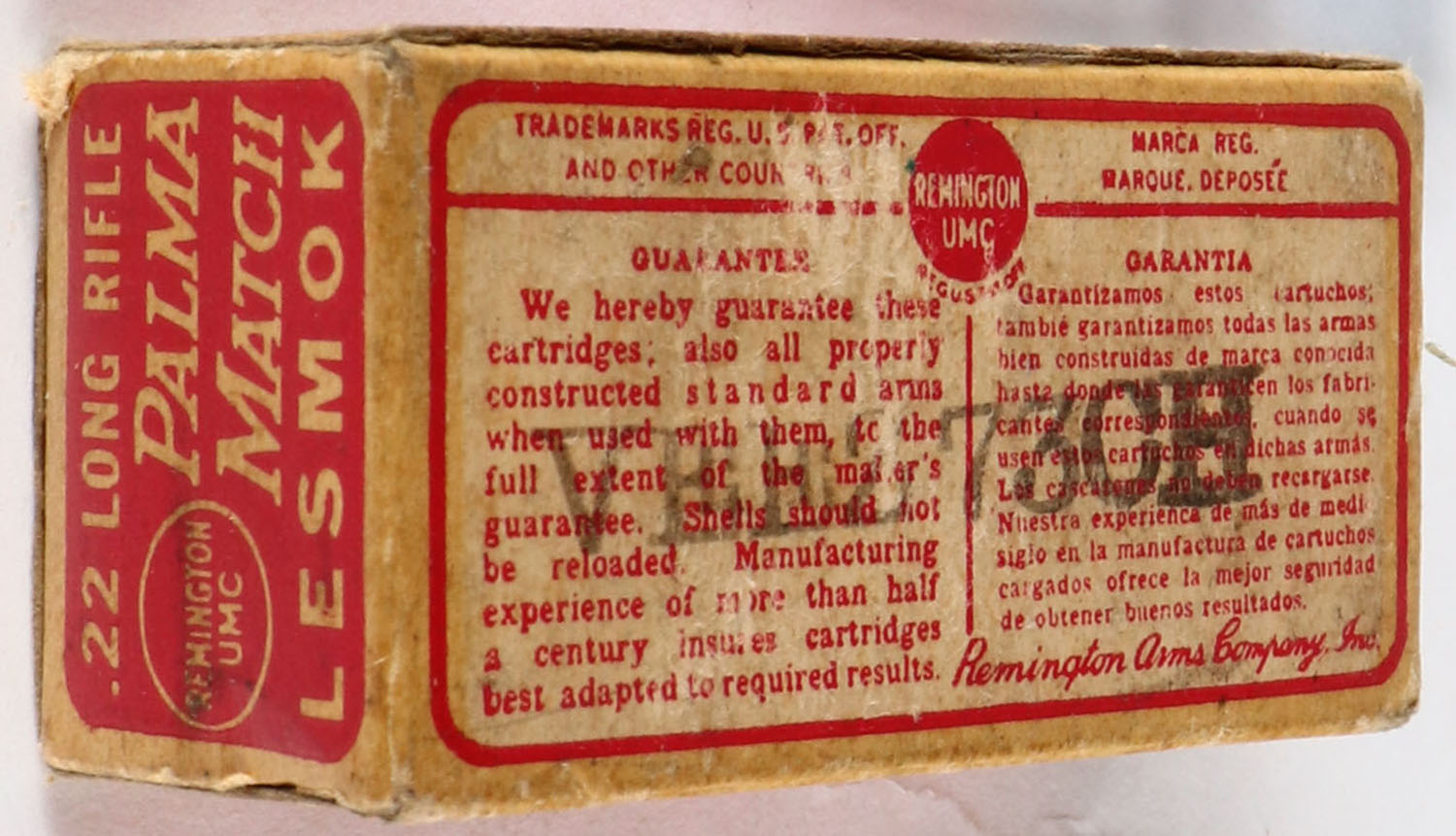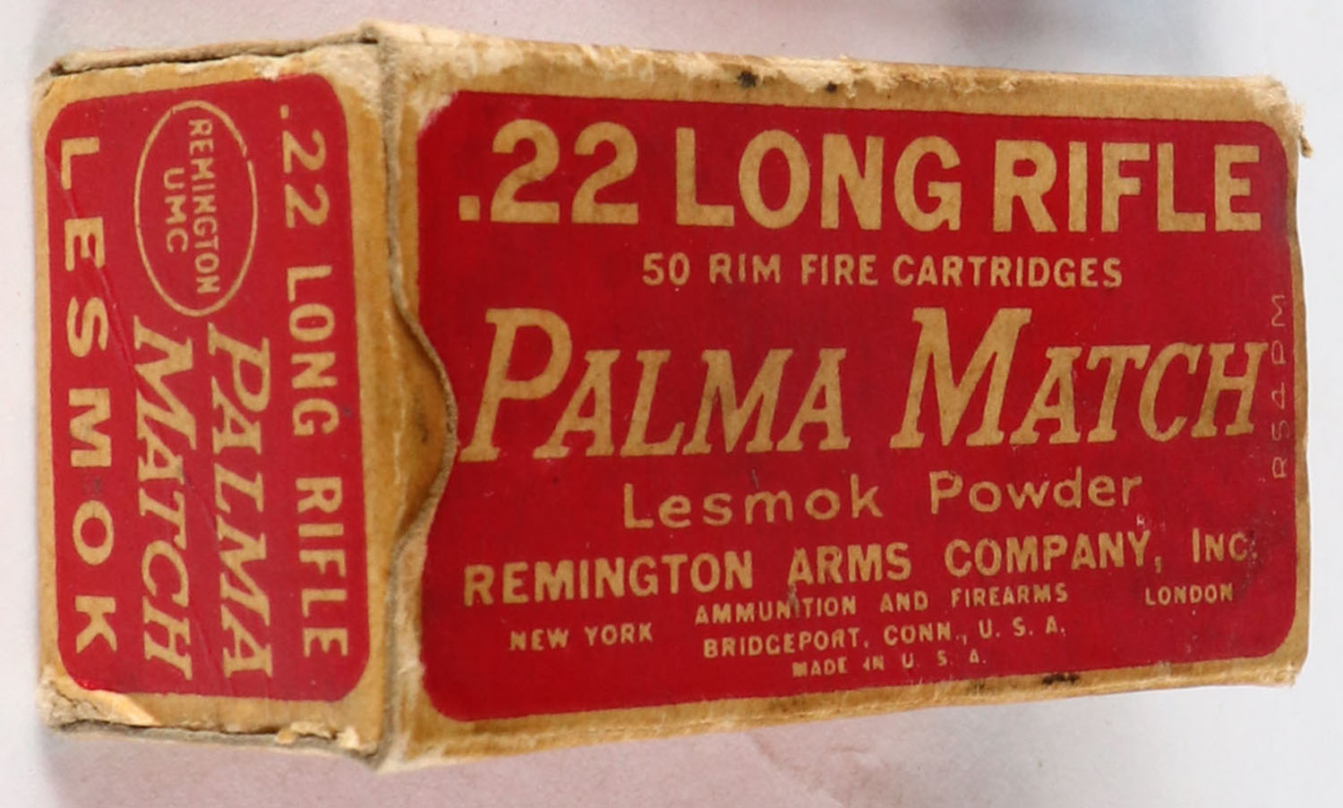 Remington, Palma Match, .22 Long Rifle, RHWeb: REM-52 LR-5b, Full, 1pc. Red & buff box, box is solid with very good color, some age soiling & corner wear, minor edge wear, end flaps are solid, ammo is very good. Grade: Very Good + - Value: 8 to 40