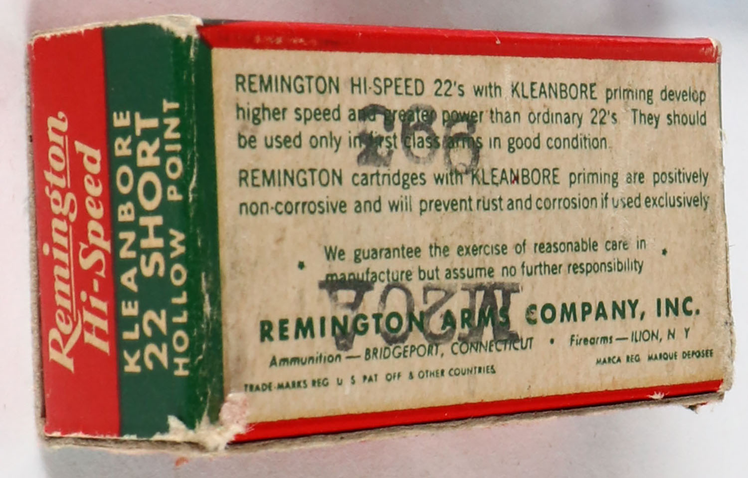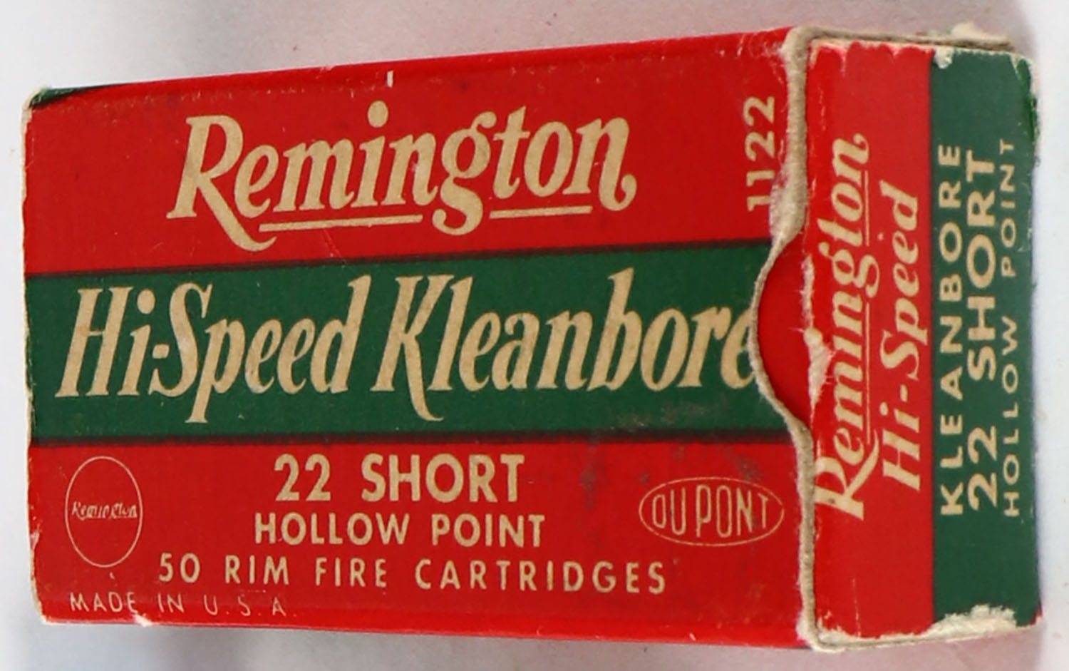 Remington, Hi-Speed Kleanbore, .22 Short Hollow Point, RHWeb: REM-14 S-2b, Partial 48rds. 1pc. Red white & green box, box is solid with very good to excellent color, minor age soiling, very minor corner wear, edges are mostly crisp, end flaps are solid, ammo is excellent. Grade: Excellent - Value: 20 to 60