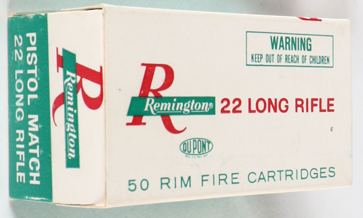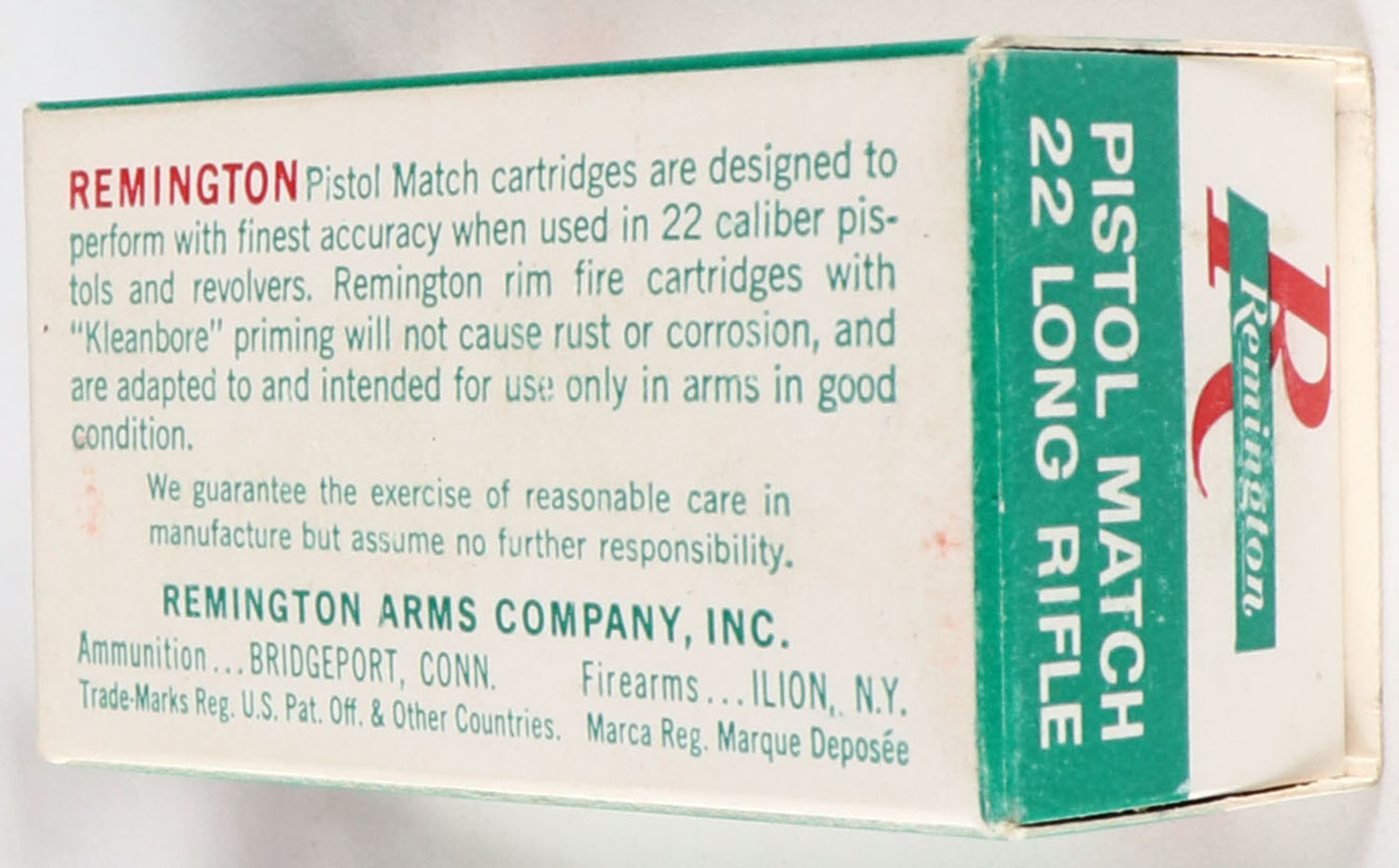 Remington, Pistol Match, .22 Long Rifle, RHWeb: REM-54 LR-11b, Full, 1pc. White green & red box, box is near mint with minty color, only very minor age soiling on bottom, corners are sharp, edges are crisp, end flaps are solid, ammo is minty. Grade: Excellent ++ - Value: 8 to 40