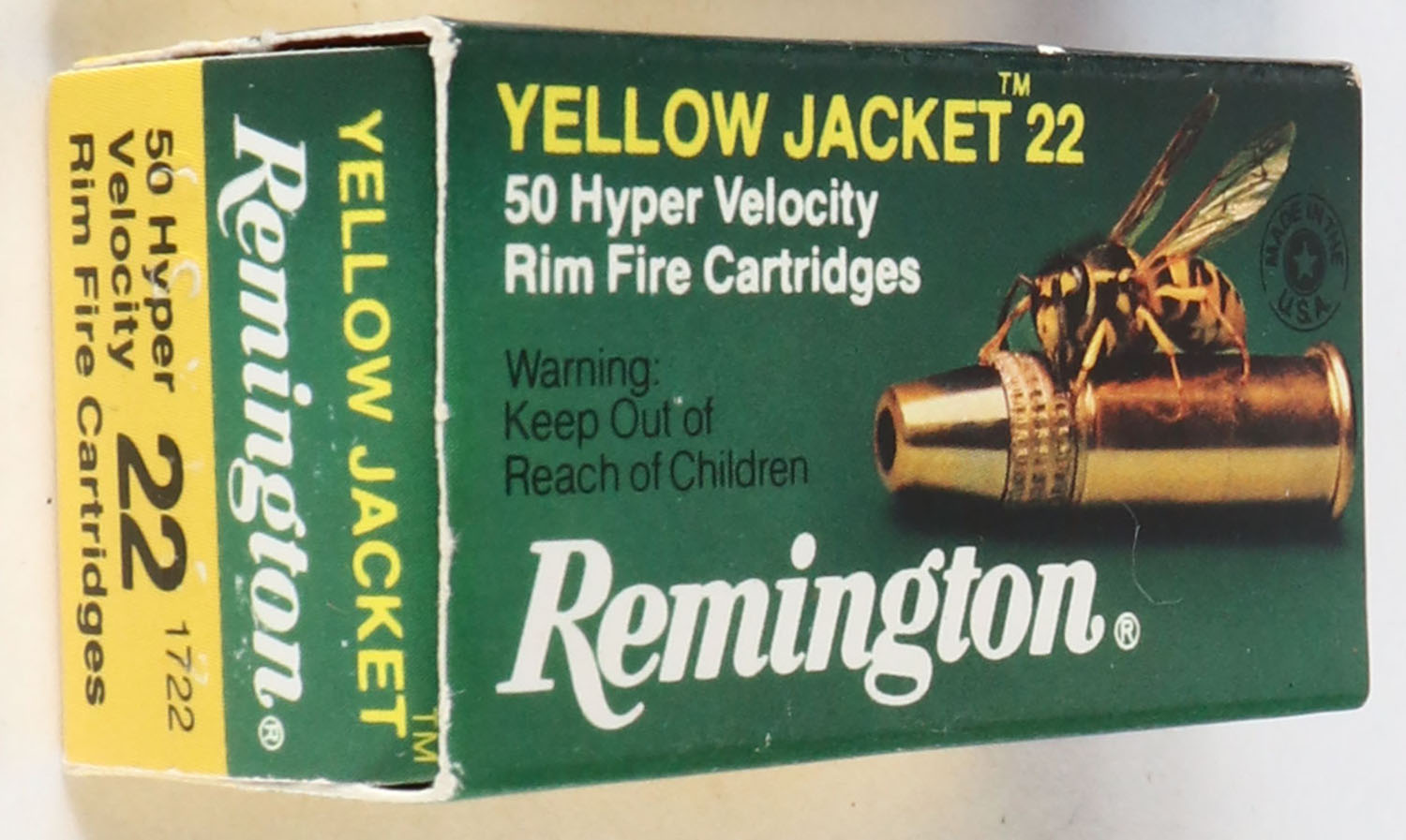 Remington, Yellow Jacket 22, .22 Long Rifle Hollow Point, Hyper Velocity, RHWeb: REM-32 LR-2, Full, 1pc. Green & yellow box, box is near mint with minty color, only very minor corner wear, edges are crisp, end flaps are solid, ammo is minty. Grade: Excellent ++ - Value: 10 to 40