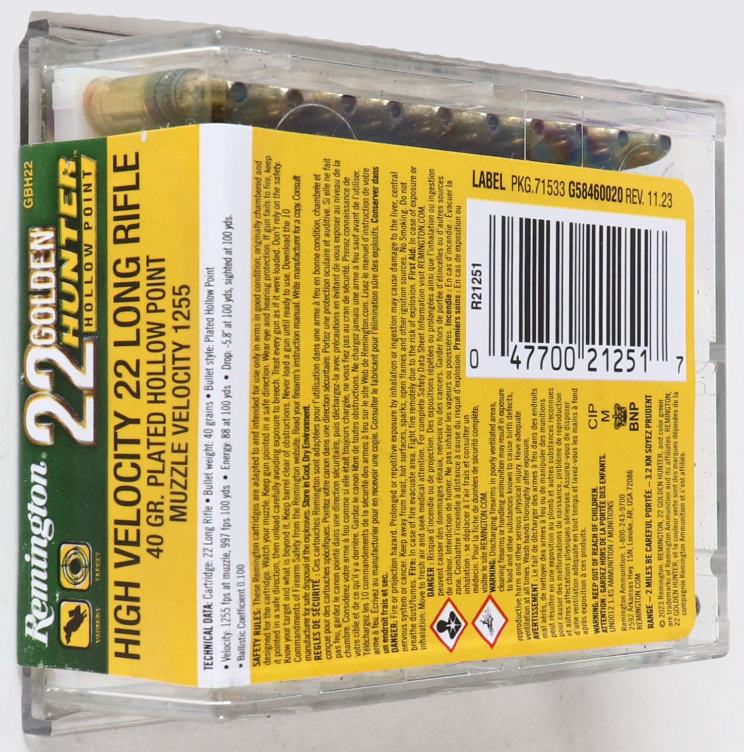 Remington, Golden Hunter, .22 Long Rifle Hollow Point, 40 Grain Plated H.P., 1255 FPS, FULL & SEALED, 2pc. Clear plastic tray with green sealing label, box is MINT with mint color, ammo appears mint. Grade: MINT - Value: 16 to 80