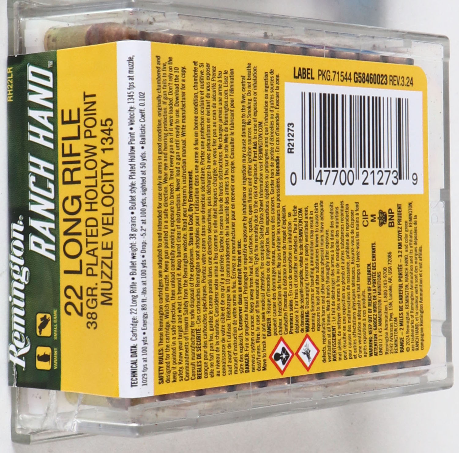 Remington, Ranch Hand, .22 Long Rifle, 38 Gr. Plated Hollow Point, 1345 FPS, FULL & SEALED, 2pc. Clear plastic tray with green & yellow sealing label, box is MINT, ammo is mint. Grade: MINT - Value: 16 to 80