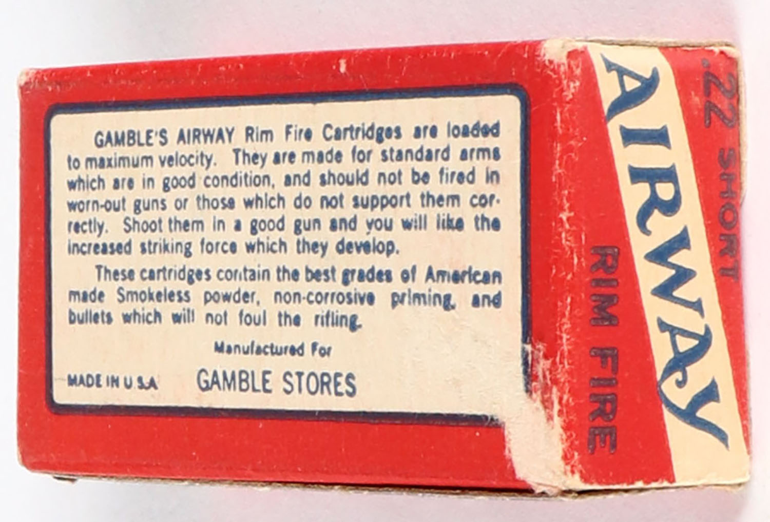 Gambles, Airway, .22 Short, RHWeb: GS-1 S-b, Full, 1pc. Red white & blue box, box is solid with excellent color, very minor age soiling & corner wear, edges are crisp, end flaps are solid, ammo is excellent. Grade: Excellent - Value: 20 to 80