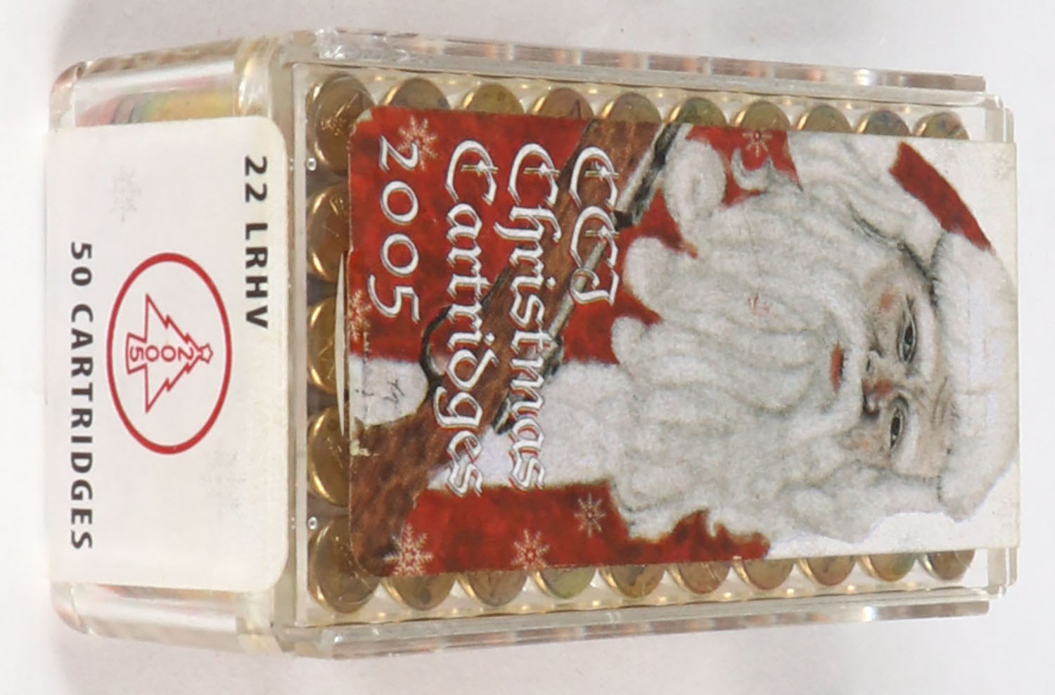 CCi, Merry Christmas 2005, .22 Long Rifle, High Velocity, RHWeb: CCI-19 LR-2, FULL & SEALED, 2pc. Clear plastic tray with label featuring Santa holding his rifle, plastic tray is clean and clear, label is intact with minty color, this was the first issue Christmas box ever issued by CCi. Grade: MINT - Value: 50 to 150