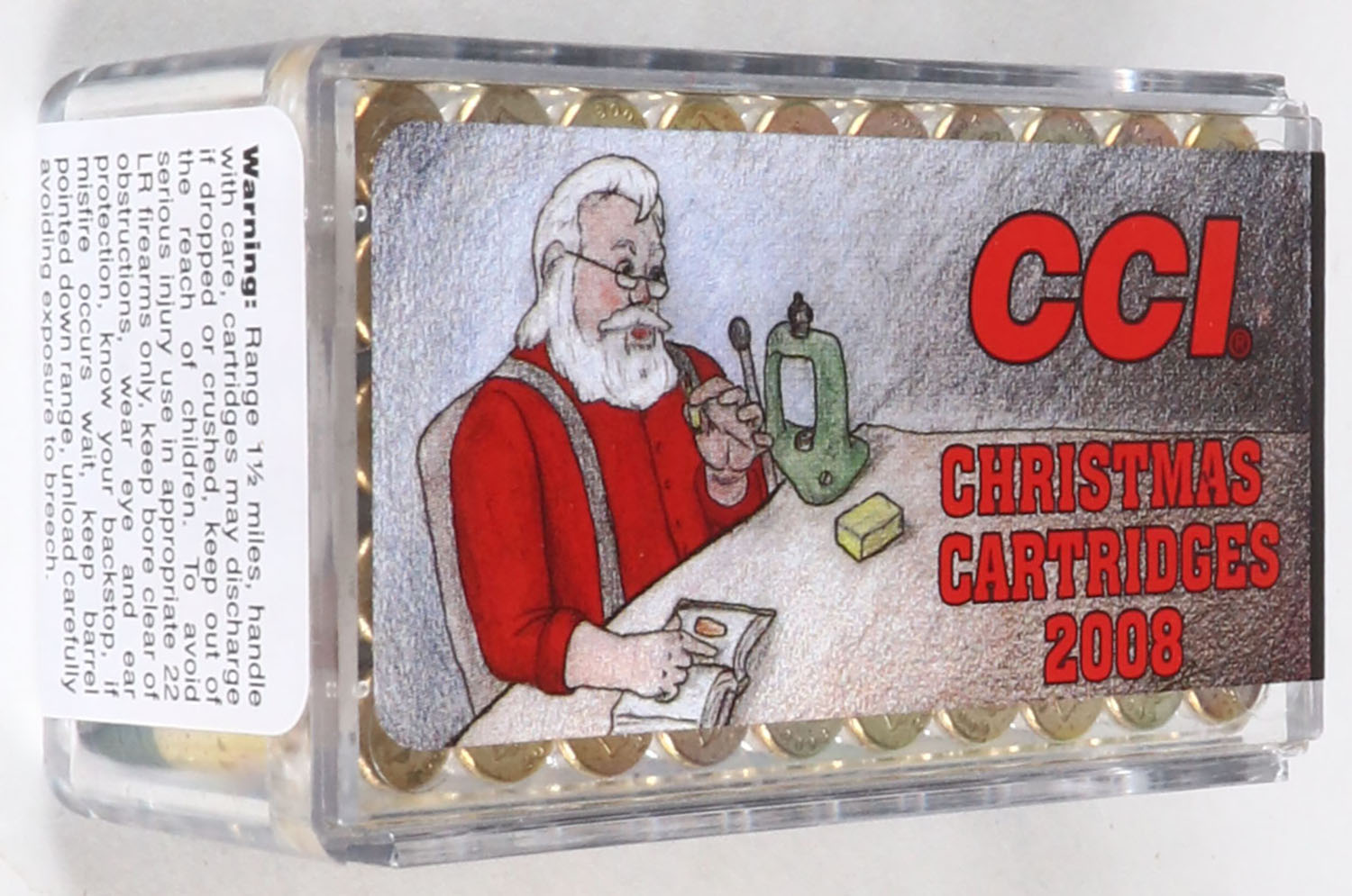 CCi, Merry Christmas 2008, .22 Long Rifle, SGB, RHWeb: CCI-19 LR-5, FULL & SEALED, 2pc. Clear plastic tray with label featuring Reloading Santa, plastic tray is clean & clear, label is intact with minty color. Grade: MINT - Value: 100 to 400