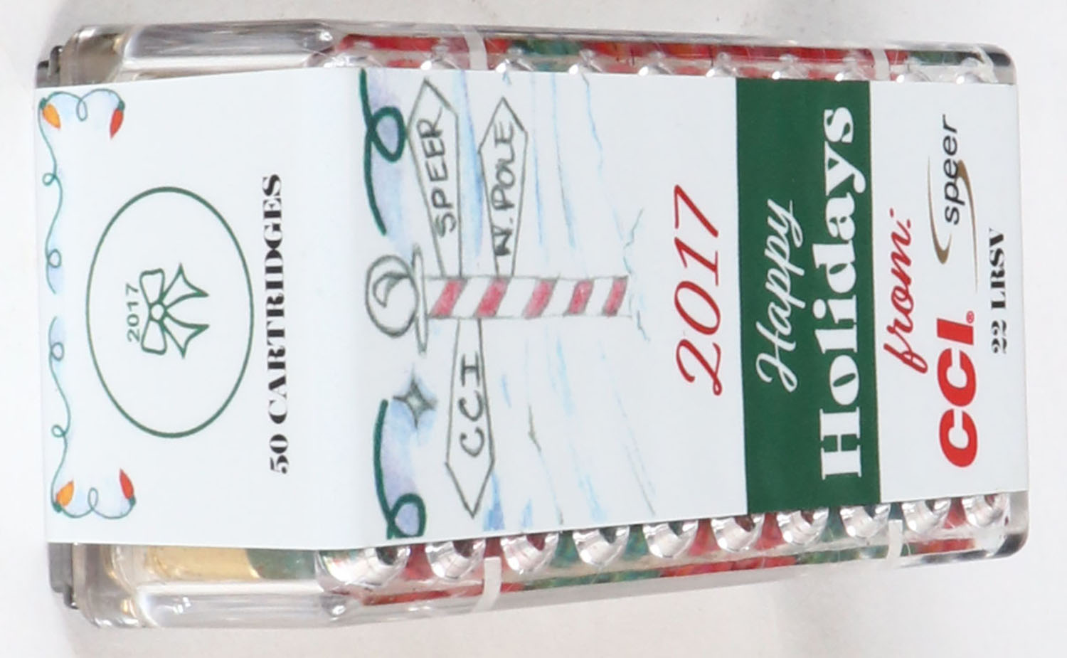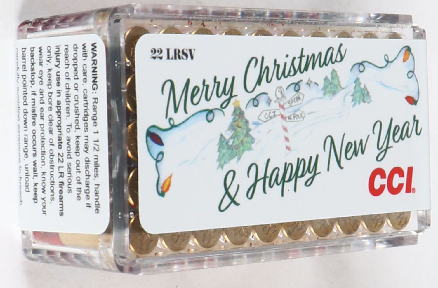 CCi, Merry Christmas 2017, .22 Long Rifle, Standard Velocity, FULL & SEALED, 2pc. Clear plastic tray with label featuring a festive Christmas scene, tray is clean & clear, label is intact with minty color. Grade: MINT - Value: 40 to 120
