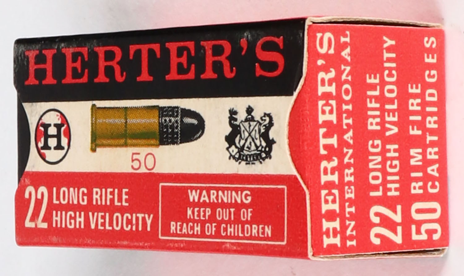 Herters, High Velocity, .22 Long Rifle, RHWeb: HERT-1, LR-1a, Partial 48rds. Correct, 1pc. Red black & white box, box is solid with excellent color, very minor shelf wear, corners are sharp, edges are crisp, end flaps are solid, ammo is excellent. Grade: Excellent + - Value: 6 to 30