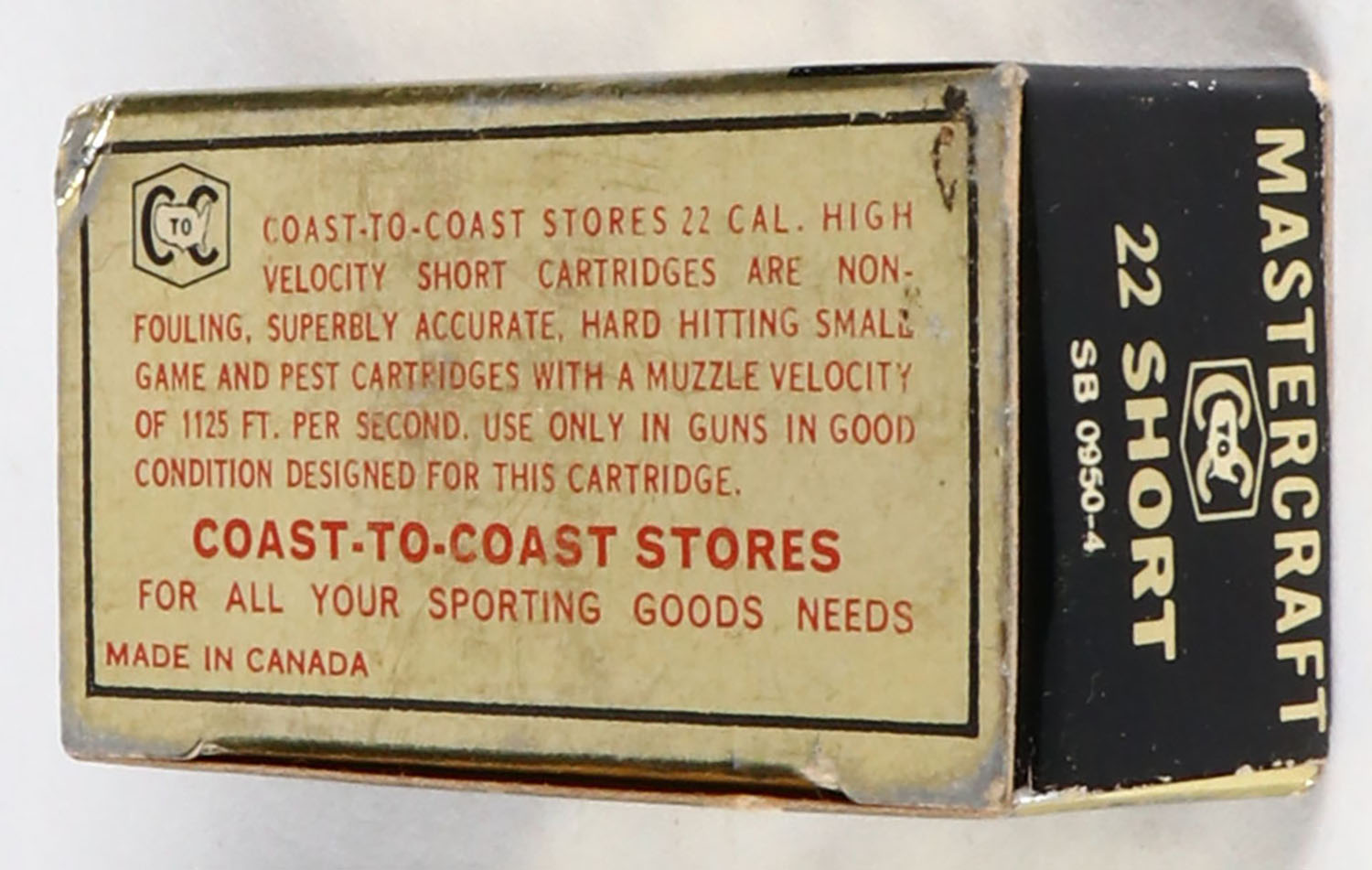 Coast to Coast, Mastercraft, .22 Short, High Velocity, RHWeb: CTC-1 S-2 (''A'' Sides, ''A'' Bottom), Partial 47rds. 1pc. Gold & black box, box is solid with excellent color, minor shelf wear, minor edge & corner wear, top flap is solid, ammo is excellent. Grade: Excellent - Value: 6 to 30