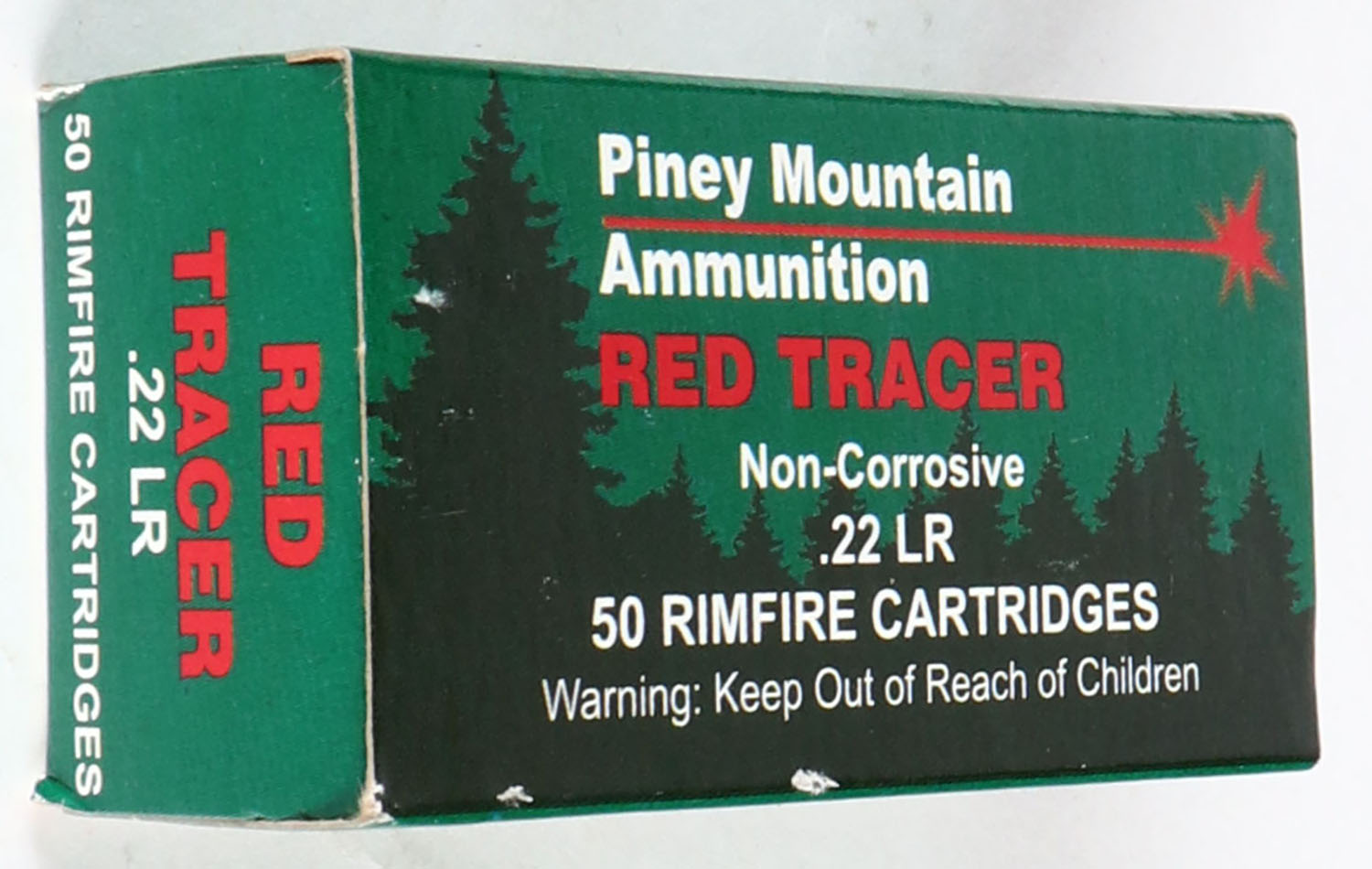 Piney Mountain, Red Tracer, .22 Long Rifle, RHWeb: PINEY-1 LR-1, Full, 1pc. Green & black box, box is near mint with minty color, only very minor edge wear, corners are sharp, end flaps are solid, ammo is minty. Grade: Excellent ++ - Value: 10 to 50