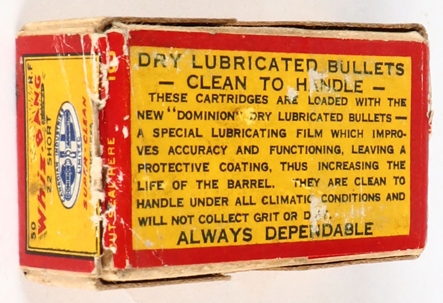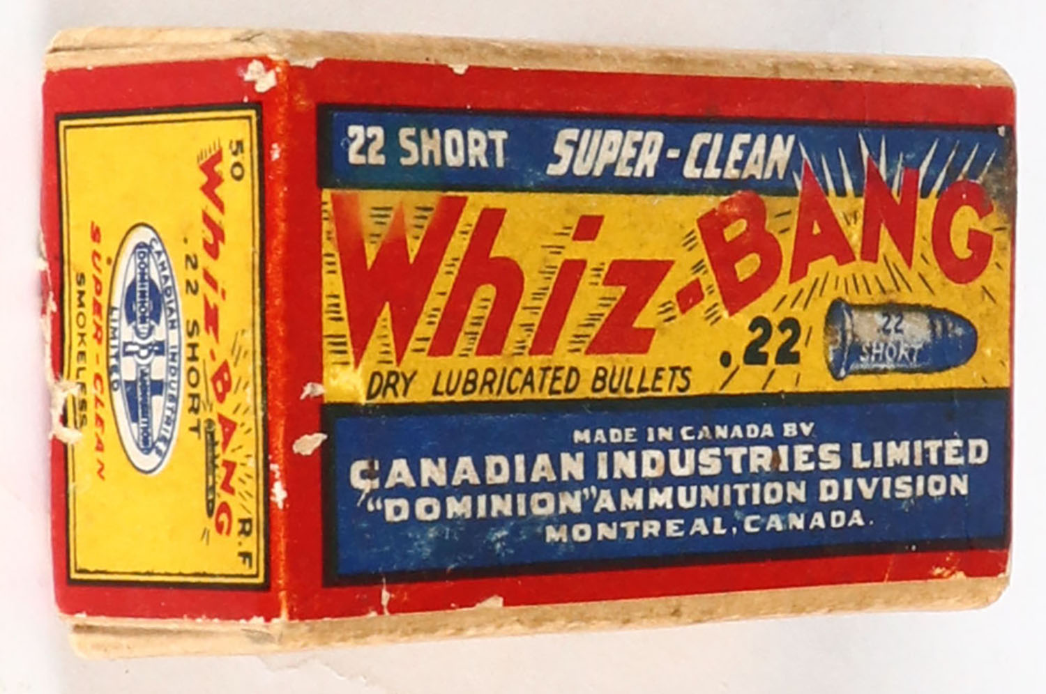 C.I.L., Whiz-Bang, .22 Short, Super-Clean, RHWeb: (Canada) CIL-2 S-4a, Full, 2pc. Buff box with blue yellow & red wraparound label, box is solid with excellent color, very minor age soiling & corner wear, edges are mostly crisp, label is intact, ammo is excellent. Grade: Excellent - Value: 30 to 90